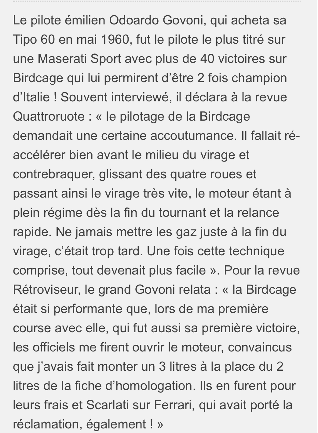 Mais le nom d’Odoardo Govini reste dans l’esprit de tous les amateurs de sport automobile absolument associé à la Birdcage qui lui offrit ses plus beaux succès !