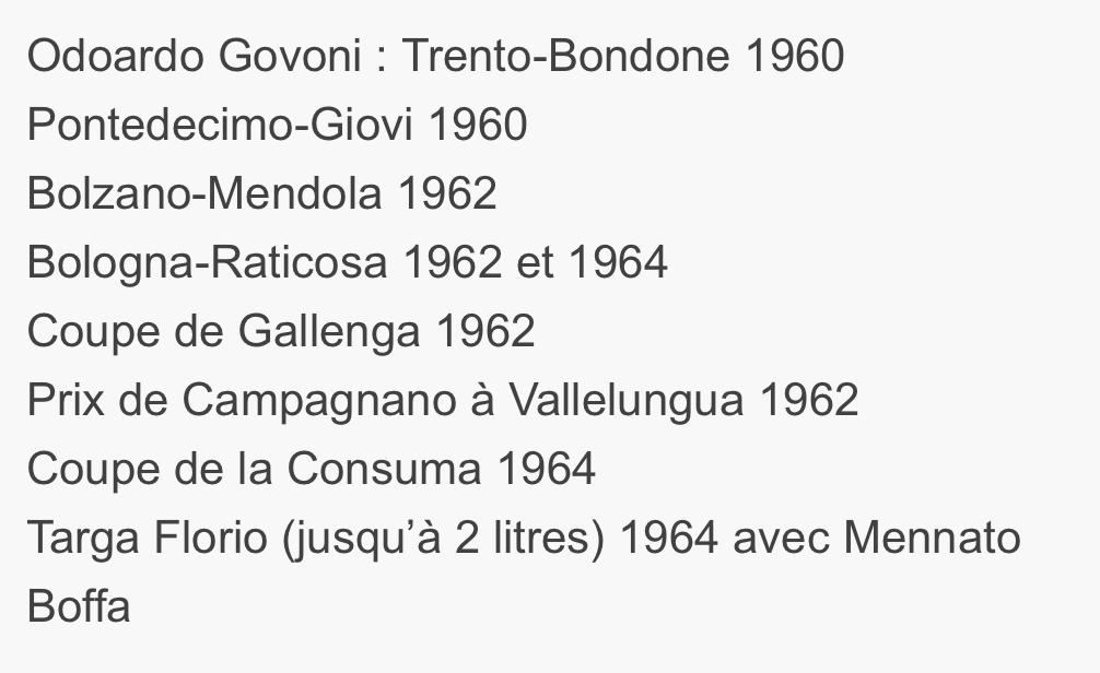 Mais c’est surtout sur sa Birdcage Tipo 60 de 2 litres qu’ Odoardo Govini va écumer les course de côte italiennes, les fameuses « cronoscalate » (escalades chronométrées). Il va en remporter 40 dont voici les plus connues :