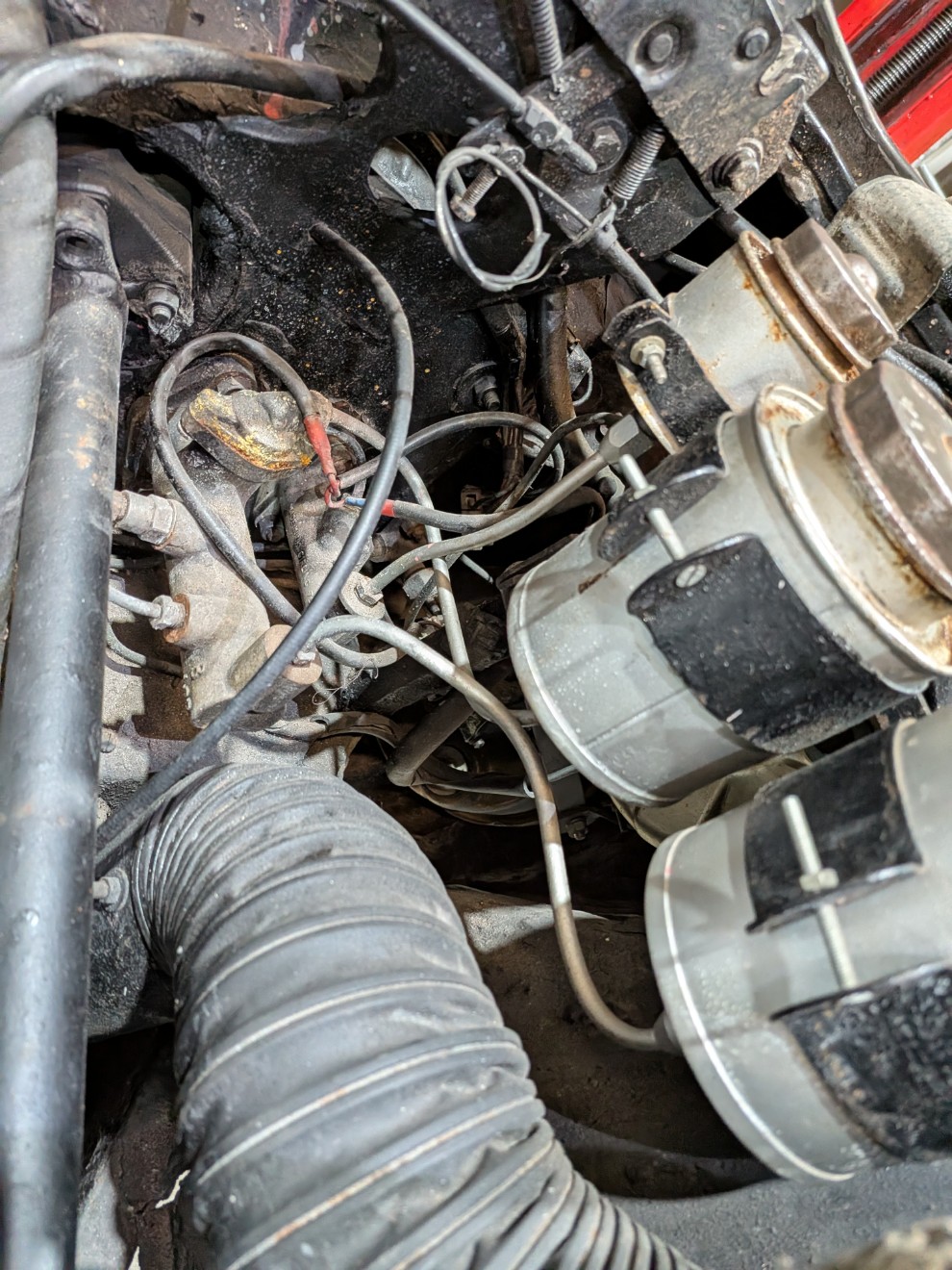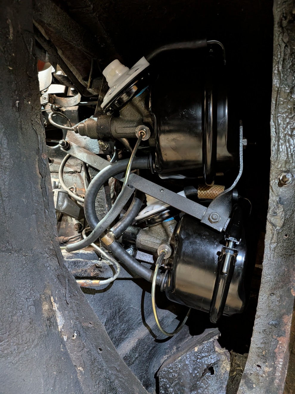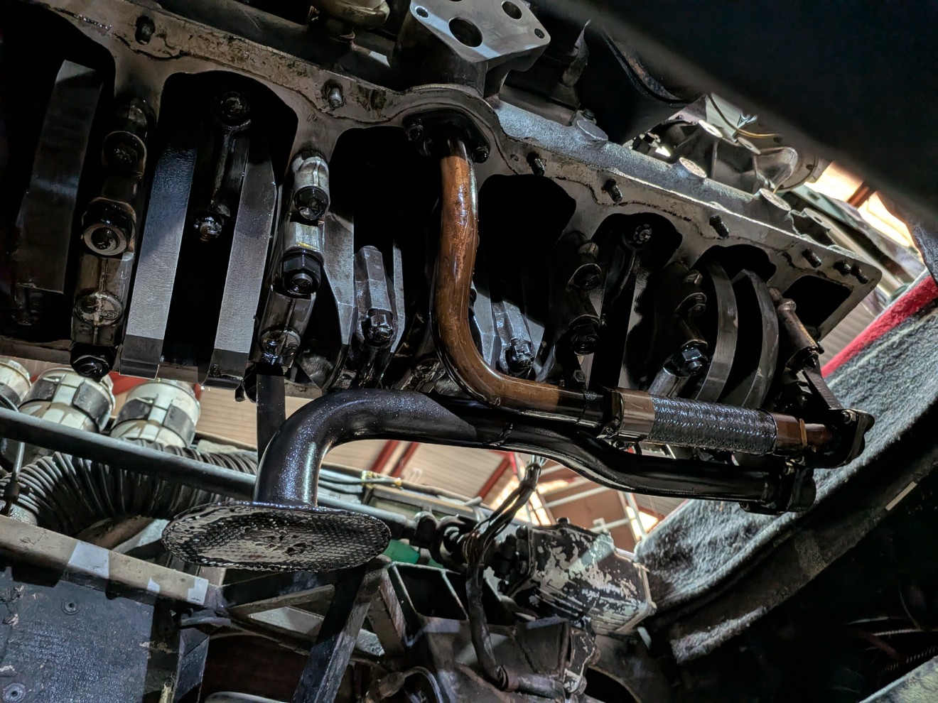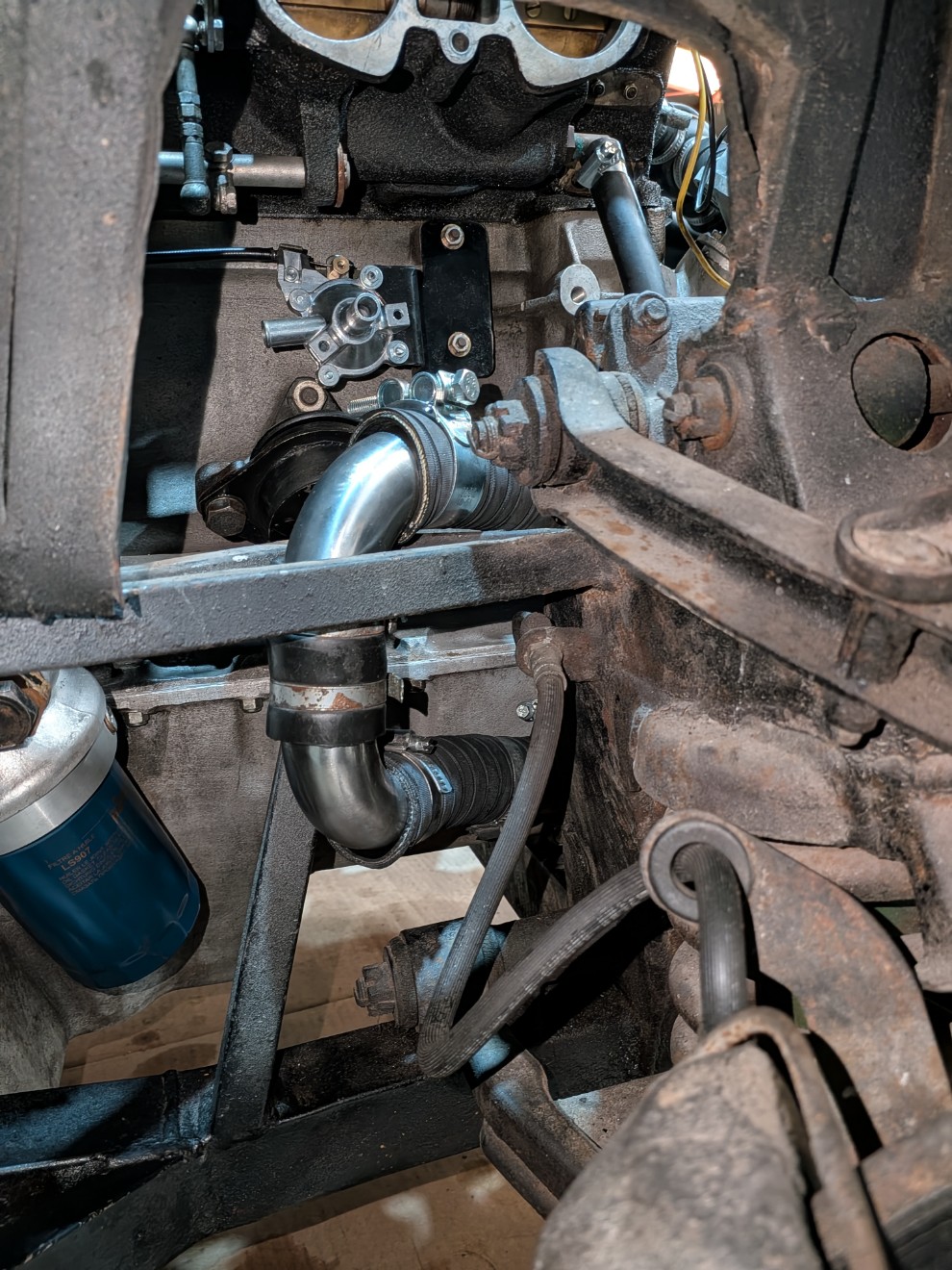 Plus de fuite au filtre à huile, c'est pas le filtre d'origine mais un pour Citroën SM. Celui-ci d'origine a un montage spécial, avec le liquide de refroidissement qui passe dedans. Ça m'a d'ailleurs bien embêté ce montage pour refaire le circuit d'eau, il est à base de T et de différentes tailles de tuyau : Le freinage :