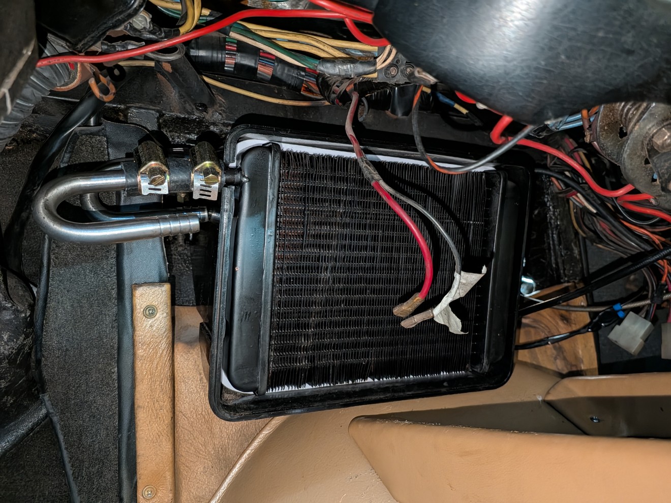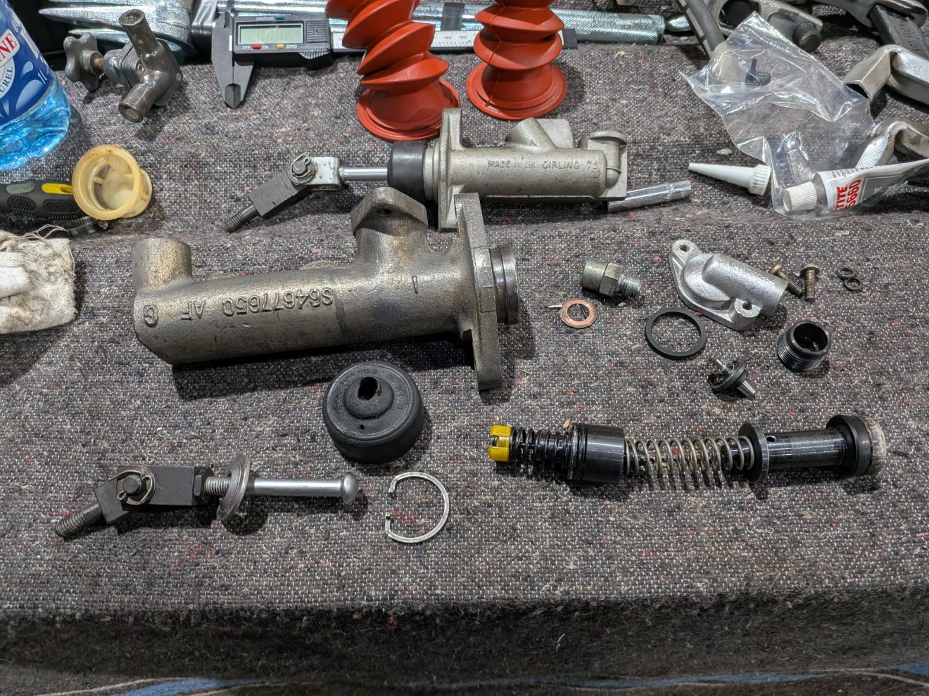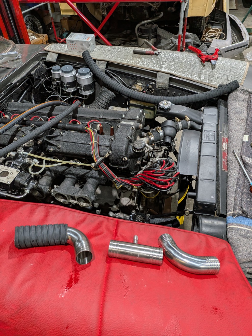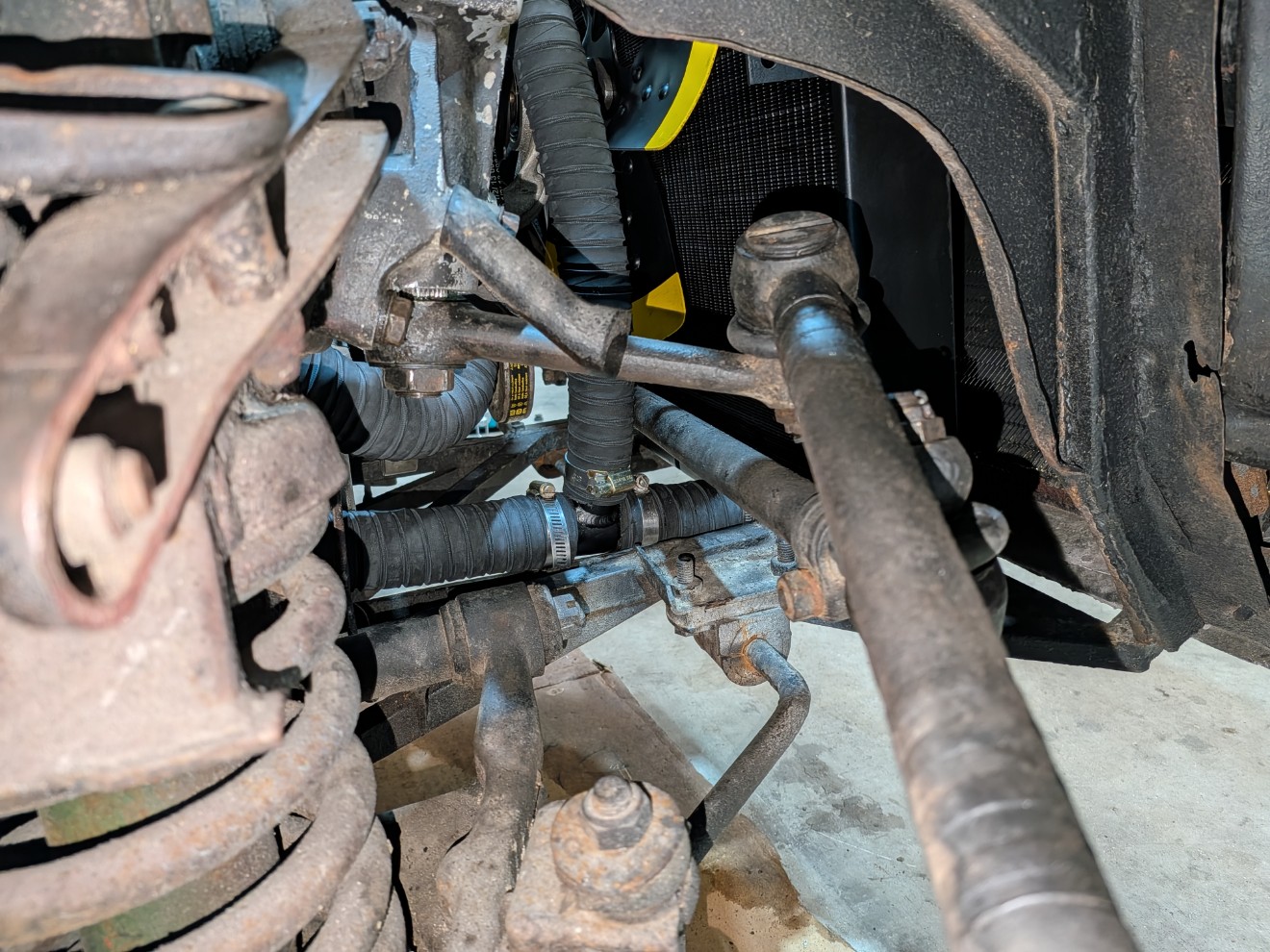 Plus de fuite au filtre à huile, c'est pas le filtre d'origine mais un pour Citroën SM. Celui-ci d'origine a un montage spécial, avec le liquide de refroidissement qui passe dedans. Ça m'a d'ailleurs bien embêté ce montage pour refaire le circuit d'eau, il est à base de T et de différentes tailles de tuyau : Le freinage :