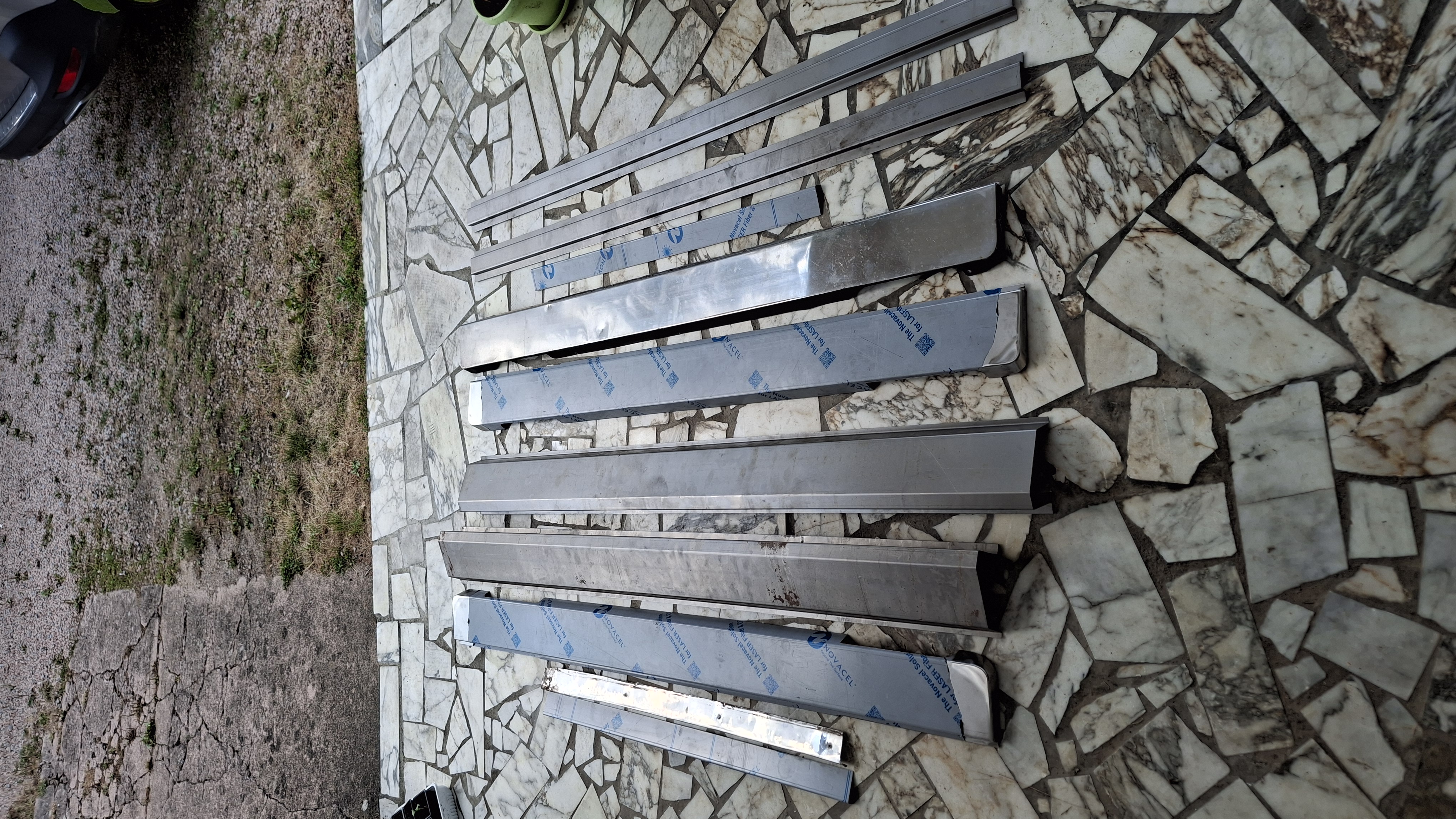 Je viens de recevoir les nouveaux bas de caisse en tôle acier de 1mm avec les raidisseurs internes à souder, ainsi que les enjoliveurs de bas de caisse que j'ai fait refaire en inox 1 mm ainsi que les seuils de portes en inox 1 mm d'épais également.