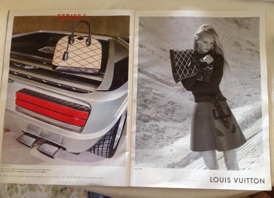 Quelle ne fut pas ma surprise de retrouver la Boomerang, concept car unique des seventies, servant de fond publicitaire pour les sacs Vuitton !