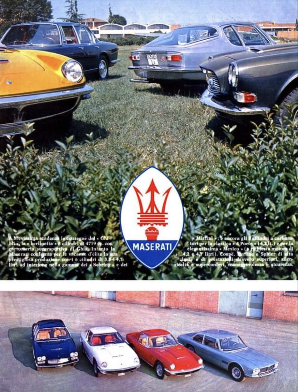La gamme Maserati vers la fin des années 60, Mistral, Mexico, Quattroporte I série 2. Manquent Sebring et Ghibli.