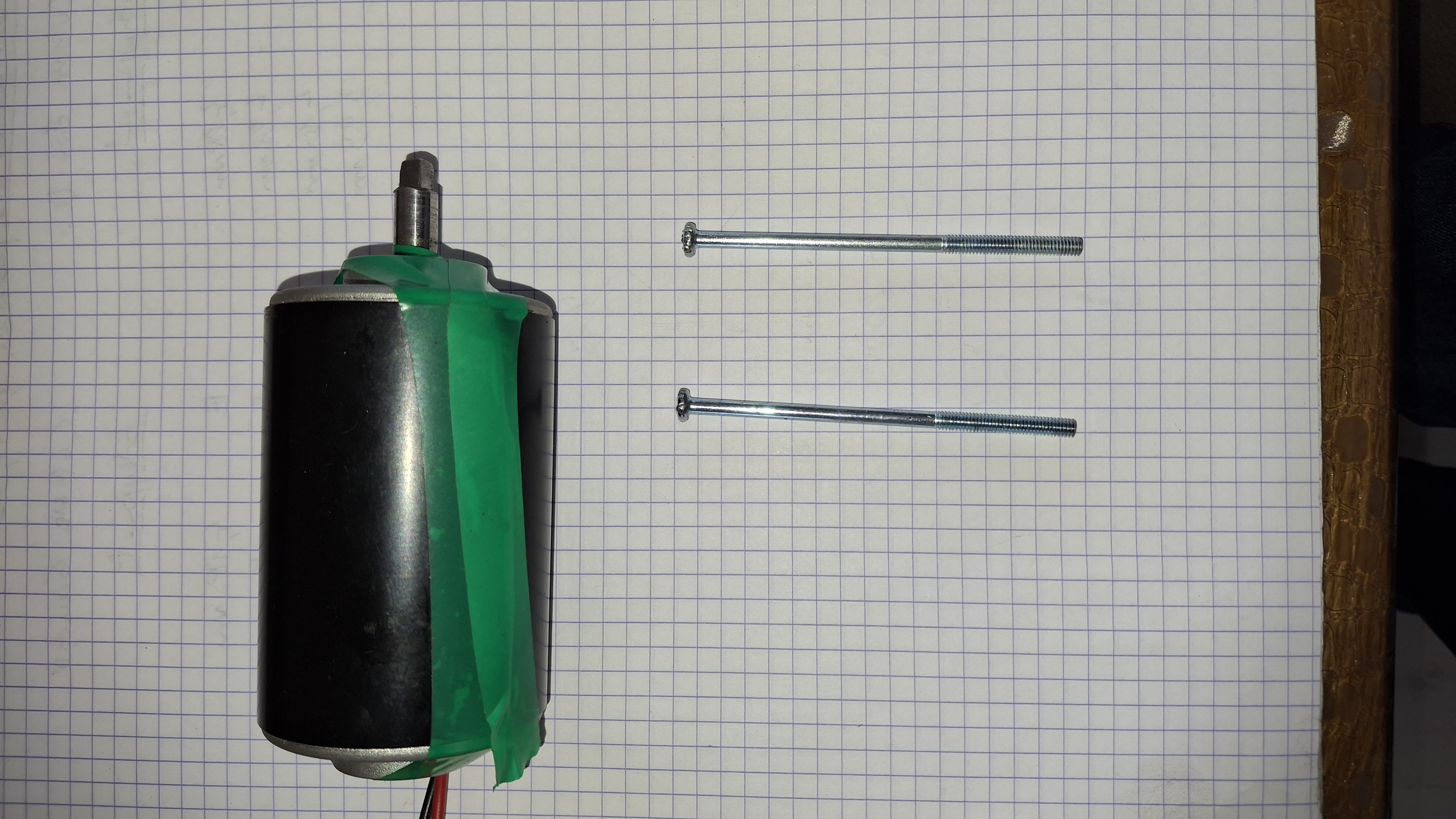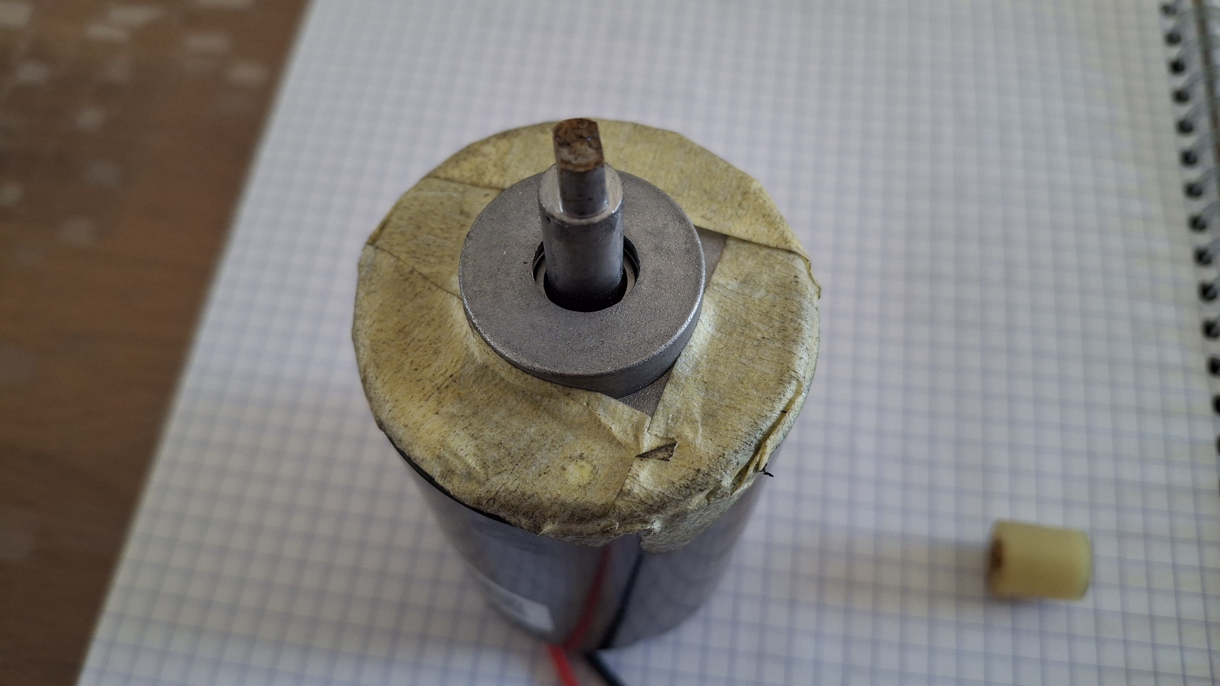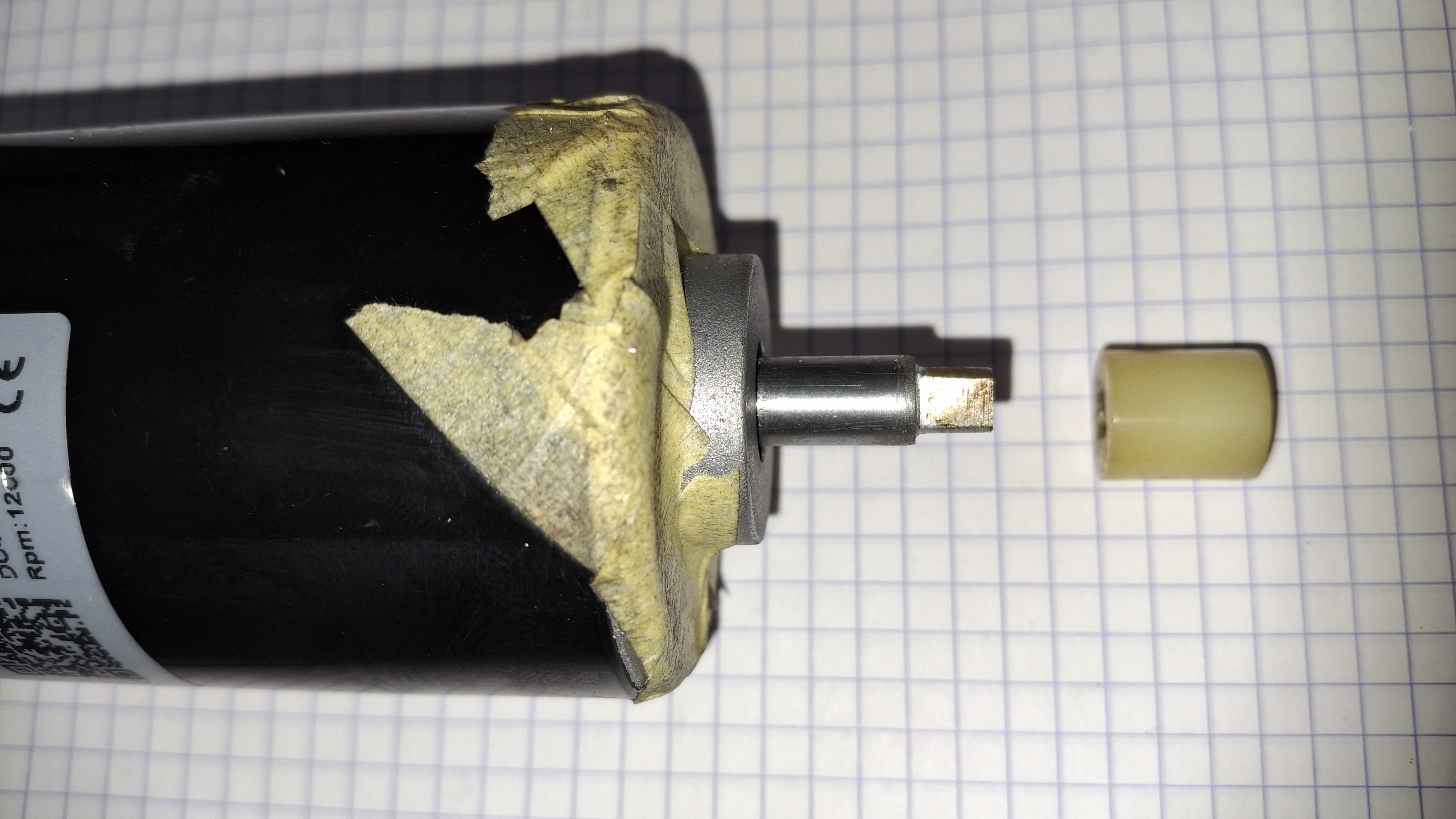 L'axe du moteur fait 8 mm, pour le ventilateur, il faut donc baguer cet axe avec un bout de tube de diamètre intérieur 8 et extérieur 10 mm pour que le ventilateur puisse se monter sans jeu sur l'arbre.