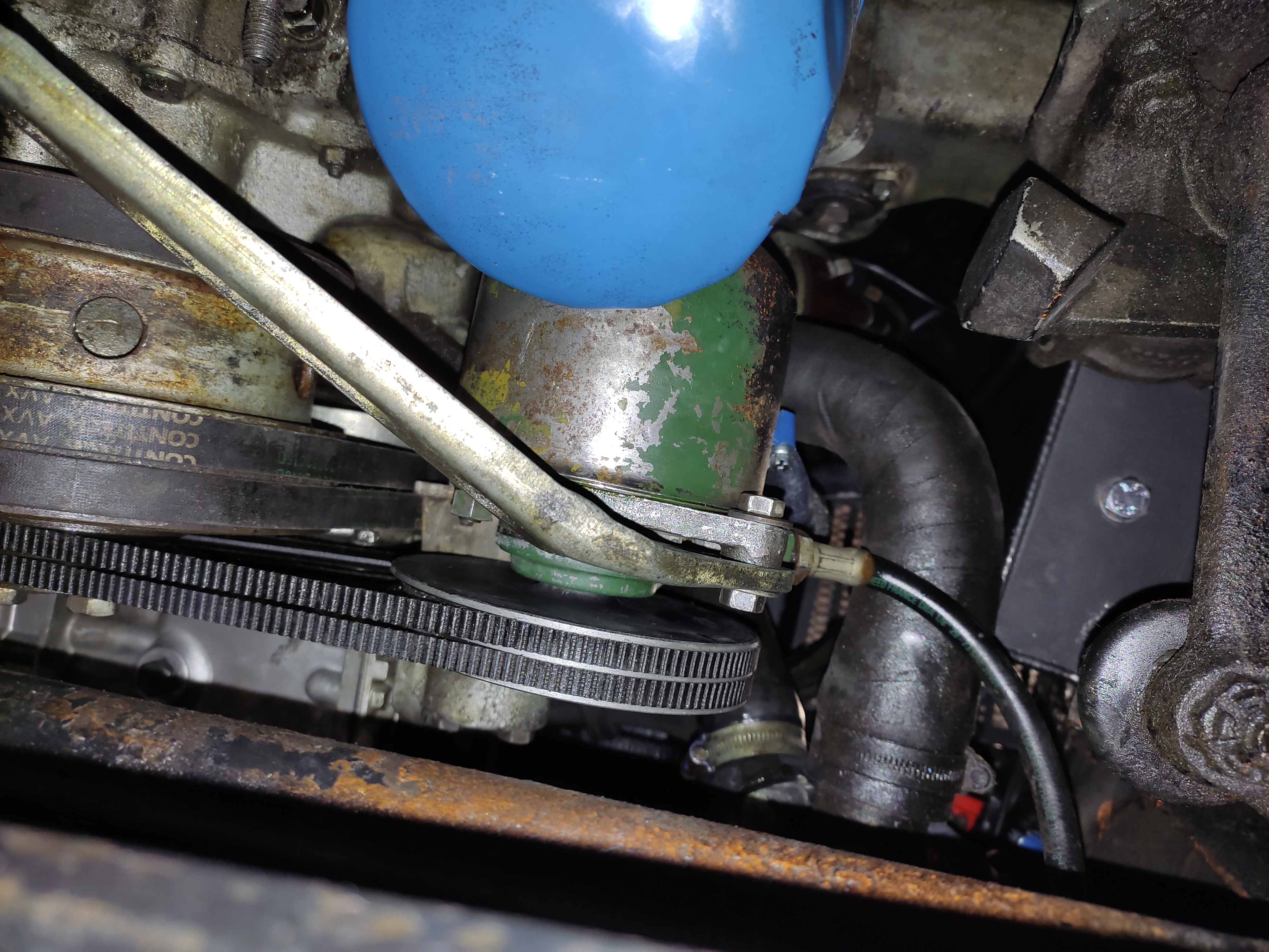 Concernant la pompe LHM, finalement Valenti l'a démontée lui-même et remplacé la pièce défaillante. Elle est maintenant remontée. Vue de dessous, on la voit ici en place (en vert, bien sûr :mrgreen: ) ainsi que le dessous du nouveau vase d'expansion de LHM en alu: