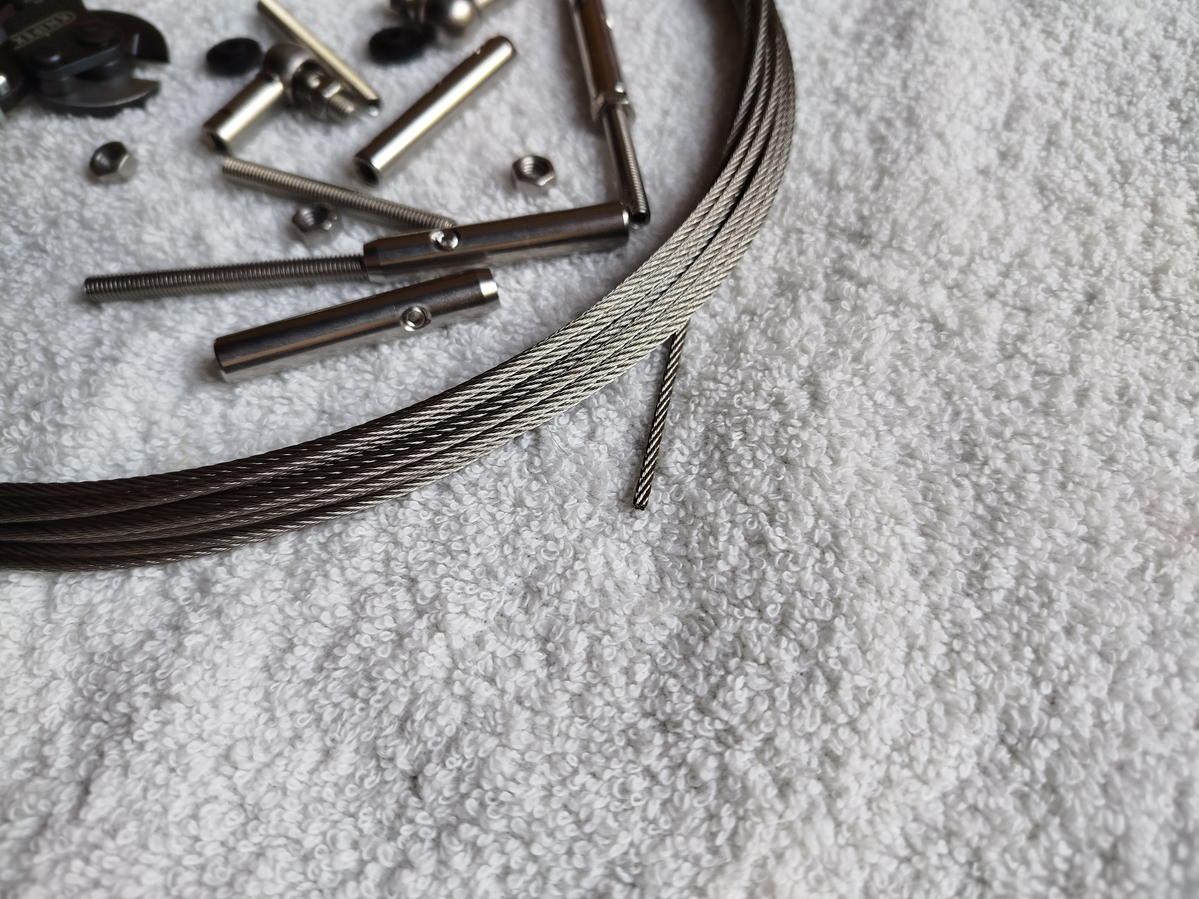 Câble de 2mm de diamètre comme d'origine, rotules et embouts filetés M5, diamètre intérieur de l'embout pour le câble 2.3 mm, juste assez pour que ce soit bien ajusté.