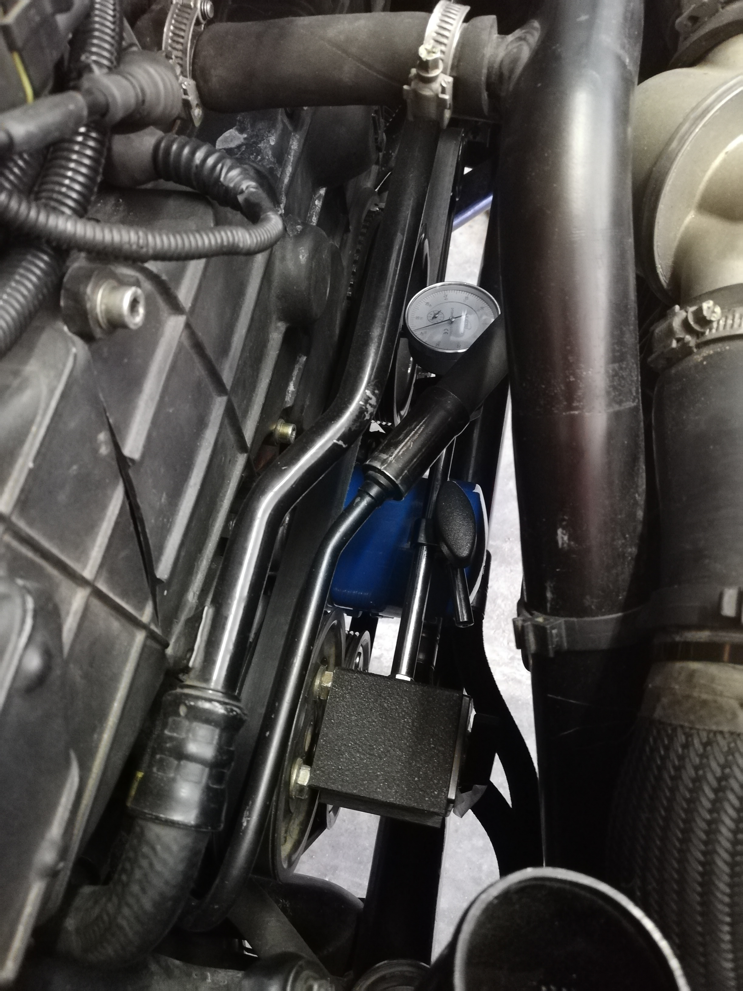 Toujours avec un démonte pneu, déplacement de la poulie du vilebrequin vers l'avant (attention au capteur de PMH), et on note le résultat : 58,5