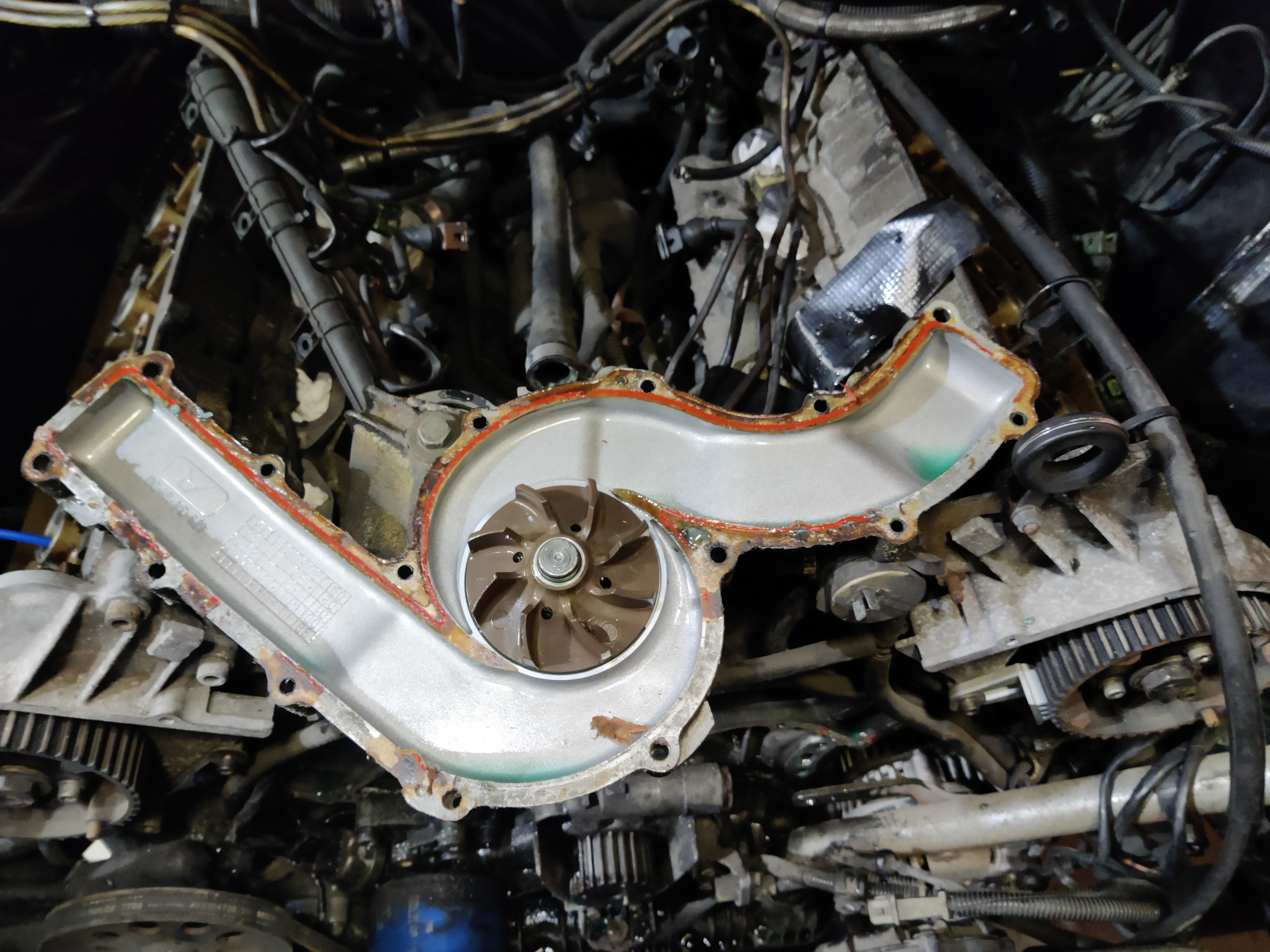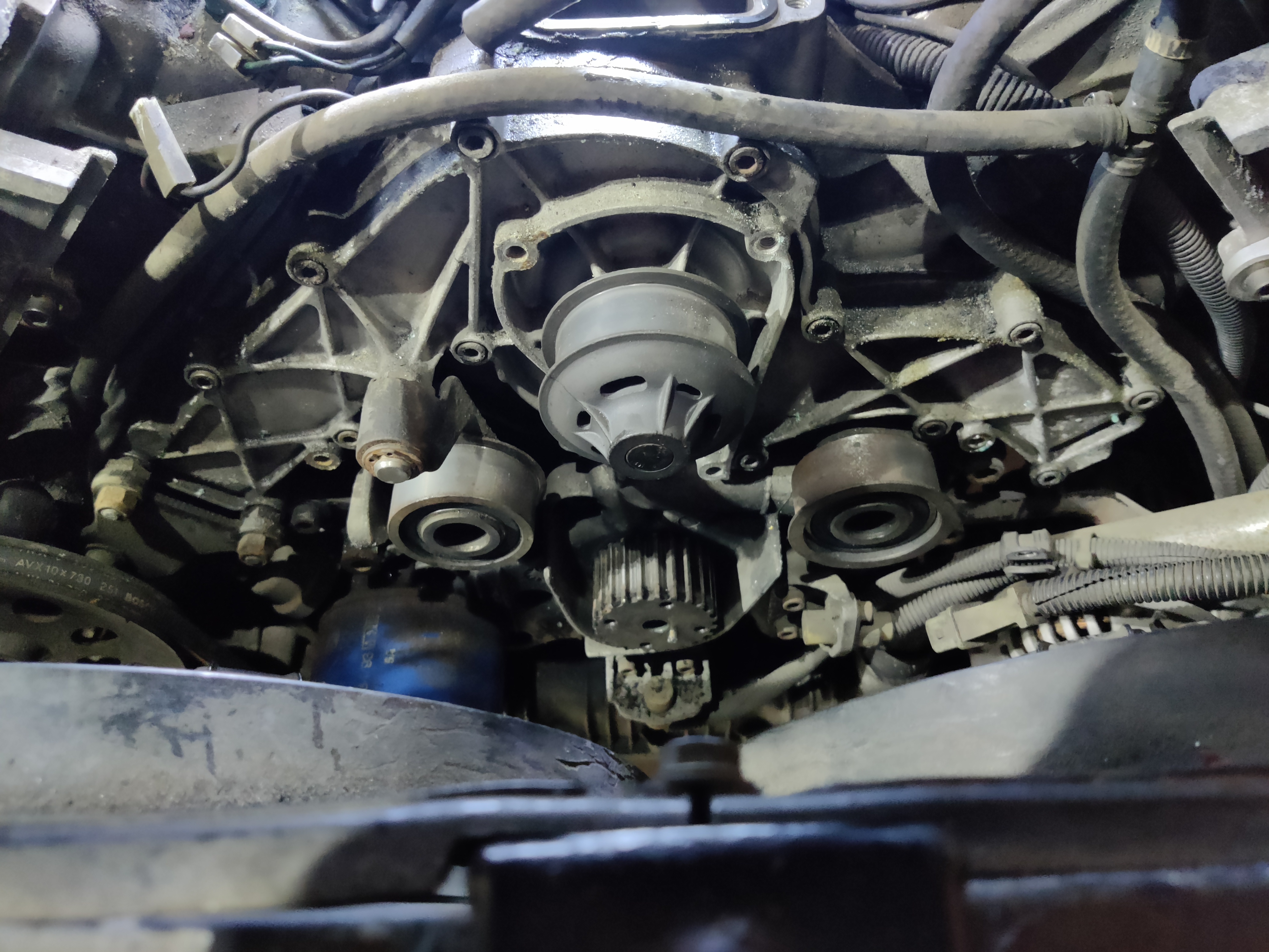 Bref, la pompe à eau est enlevée, elle semble plutôt en bon étant et je ne constate pas de jeu, mais n'ayant aucune idée de son âge...