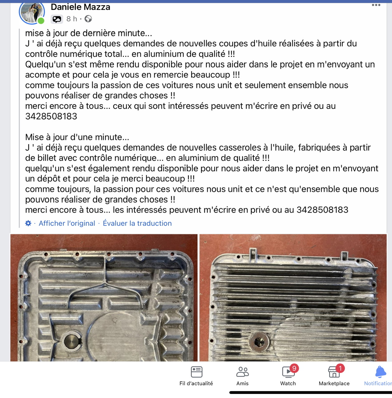 Daniele Mazza qui a fait refaire les boites à fusibles, des kits étriers, d autres trucs… propose de refaire des carters de moteur.