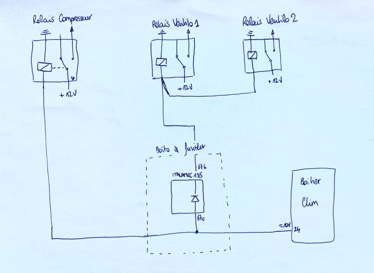 J’ai changé la diode cramée sur le fameux Italamec 135, ça change rien à mon problème de clim. Par contre, quand il est débranché, j’ai la tension en sortie de boitier de clim qui remonte aux alentours de 10 V et je retrouve ces 10 V au niveau de mon relais…