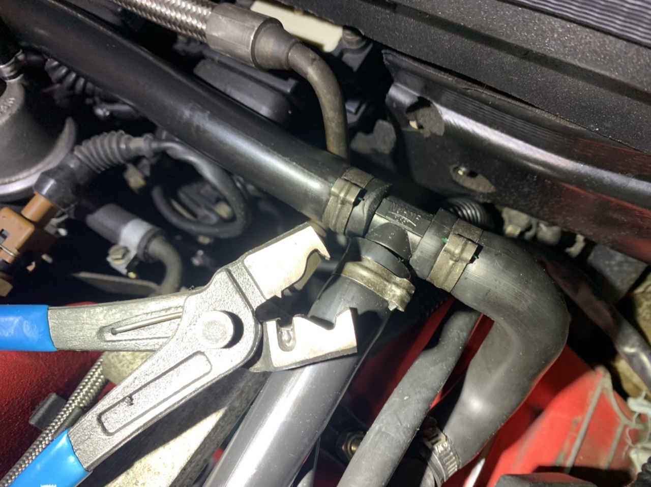 Aujourd’hui j’ai continué à chercher cette foutue fuite de LDR. Rien au niveau du chauffage, rien dans le compartiment moteur. Quelques traces autour des entrées et sorties du calorstat mais rien de probant, surtout que j’ai mis du colorant fluo dans mon bocal de LDR pour faciliter les recherches. C’est un mystère…