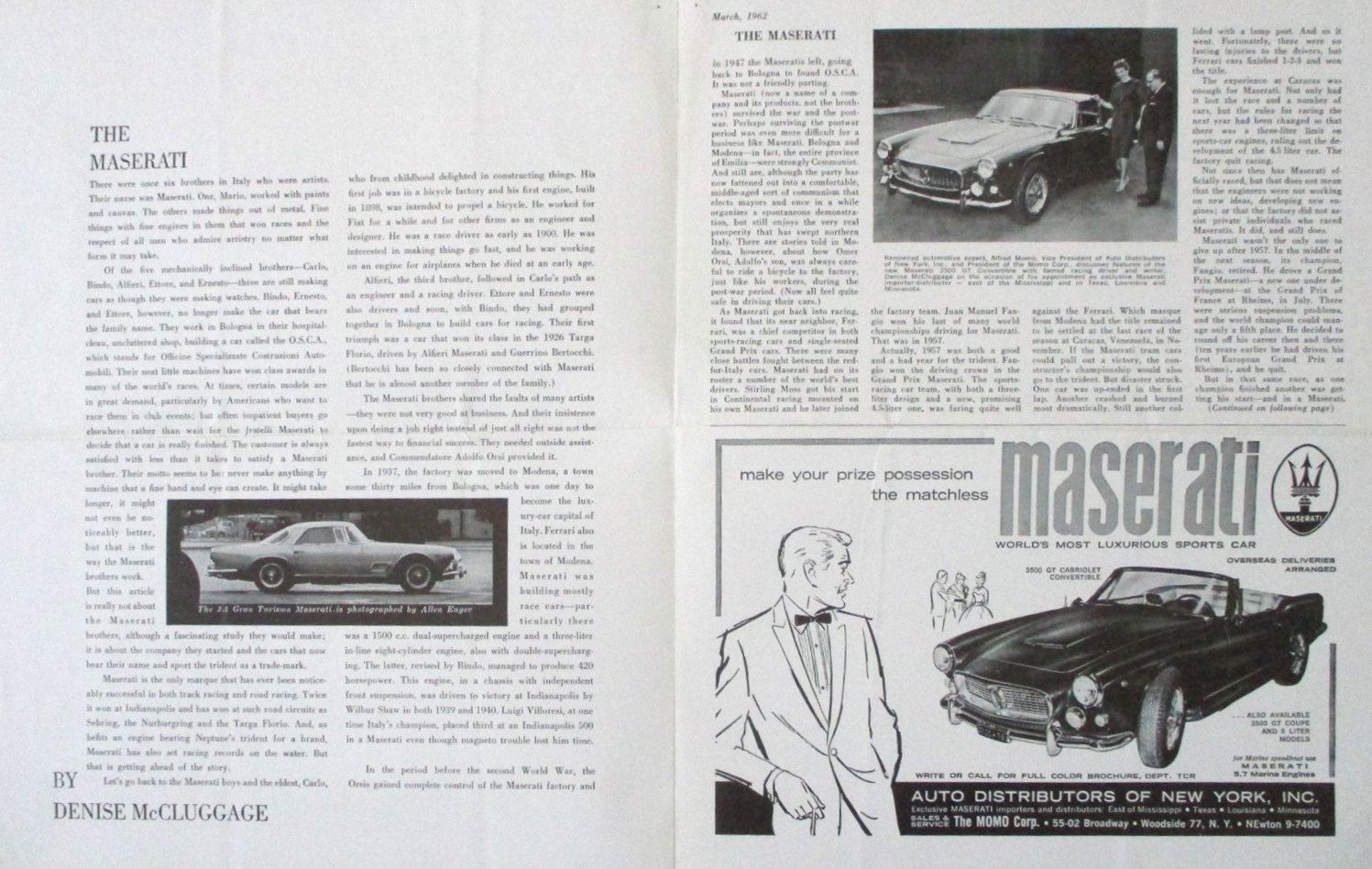Revue de presse avec ce publi-reportage publié dans le magazine Town&Country de mars... 1962, où on apprend que le communisme dominant à Modena comme à Bologne obligeait Adolfo Orsi à se rendre à l'usine à bicyclette, et où il est question d'un bateau de course propulsé par Maserati, bien antérieur au Primatist, l'hydroptère Who Dat. Plus d'information sur ce site.