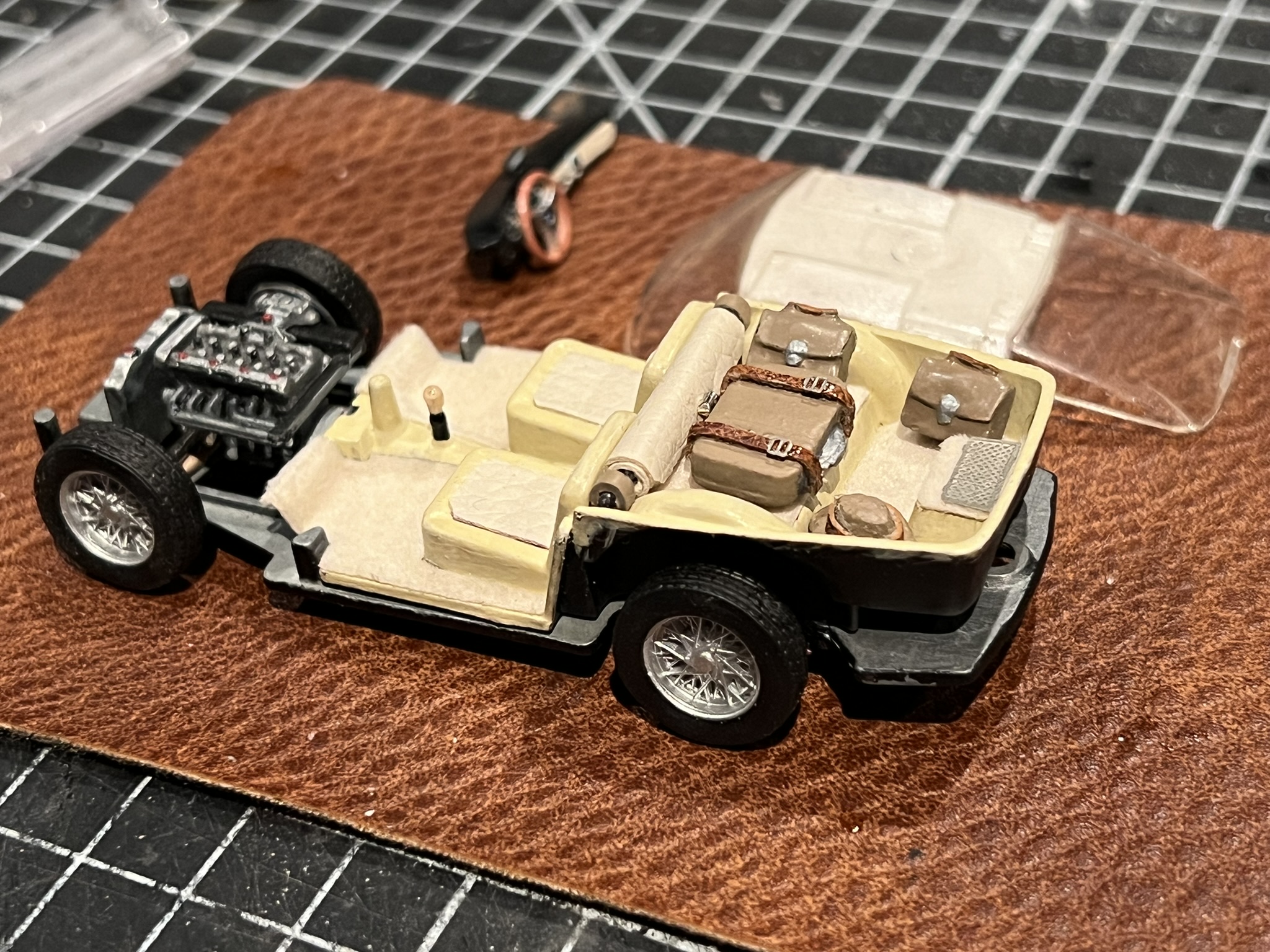 Pour l'intérieur, c'est terminé : moquette au sol et dans le coffre, cuir pour les sièges, le tableau de bord et l'enrouleur de coffre. Les détails du tableau de bord et du volant sont ok et le set de bagages est terminé :