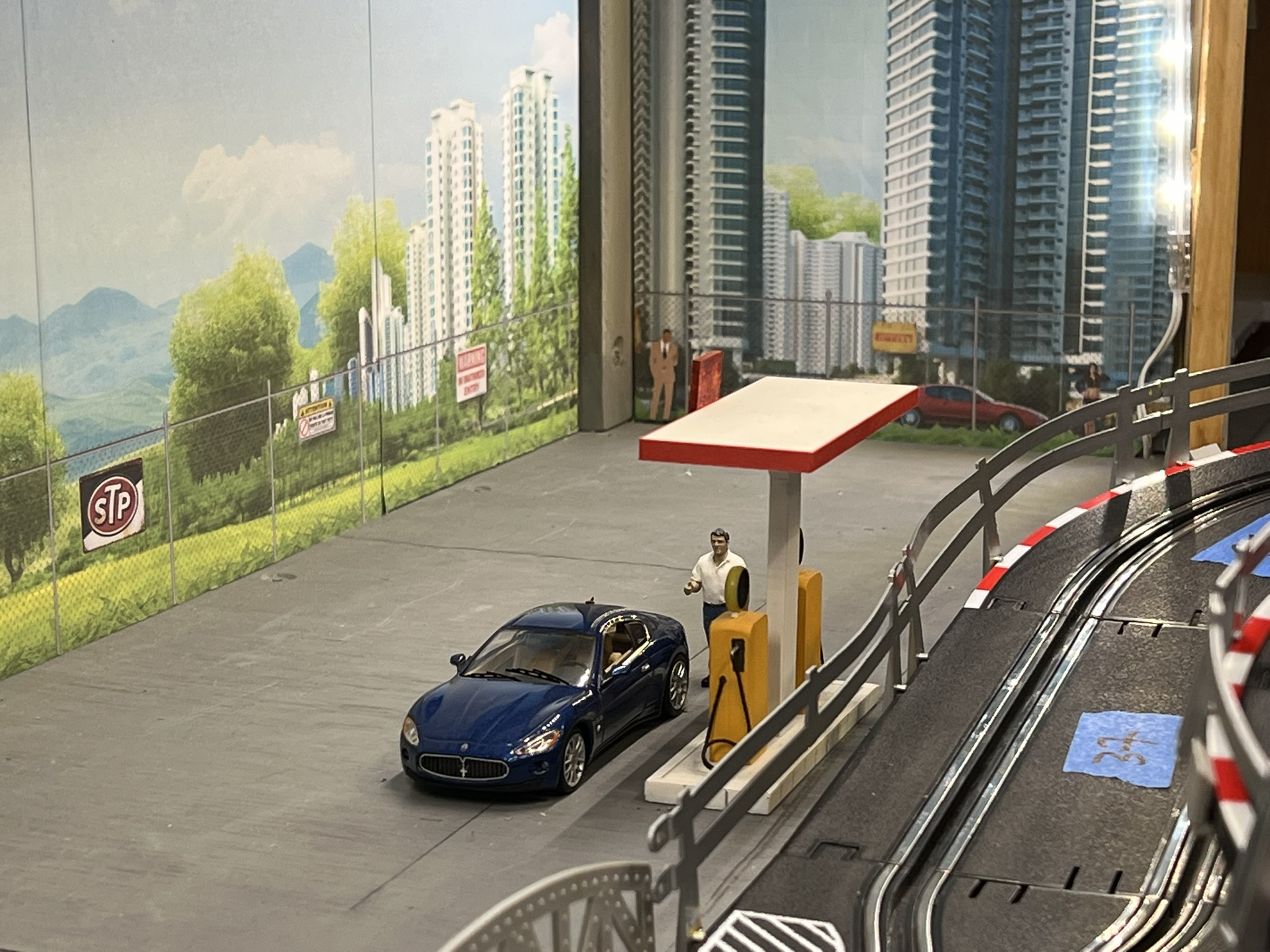 En ce moment je travaille pour avancer (et finir?) le niveau inférieur du meuble des modernes, qui accueille le circuit électrique. J'ai terminé et installé le fond, j'ai aussi préparé les repères pour les "sols", afin de choisir la surface (béton, herbe, metal, asphalte,...). Je construit aussi les bâtiments qui bordent la piste et prévois ce qu'il faut pour l'éclairage de tout ça.