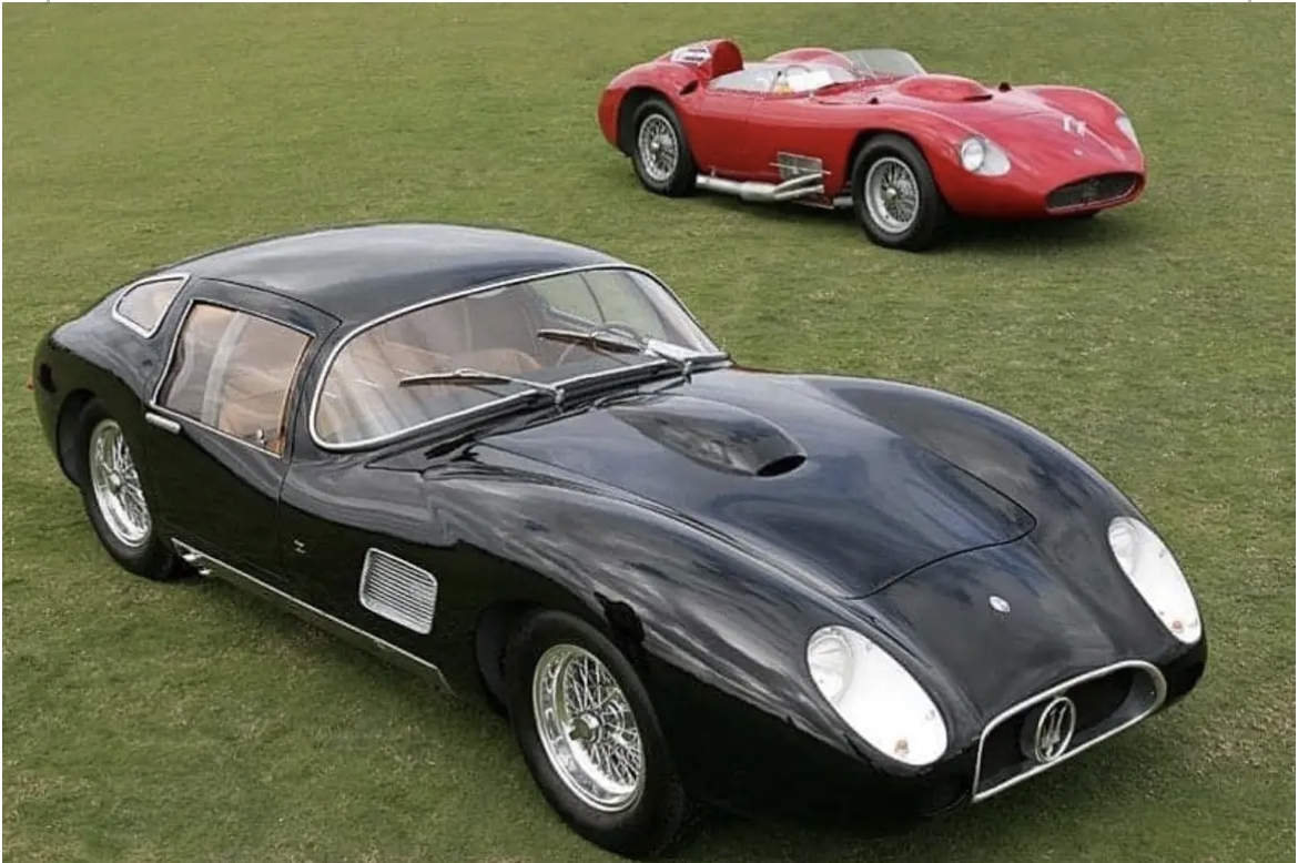 Elle fut "stradalisée" en 1958 et devint alors la plus rapide voiture de tourisme de l’époque (300 km/h). Ici avec une sœur 450S barquette :