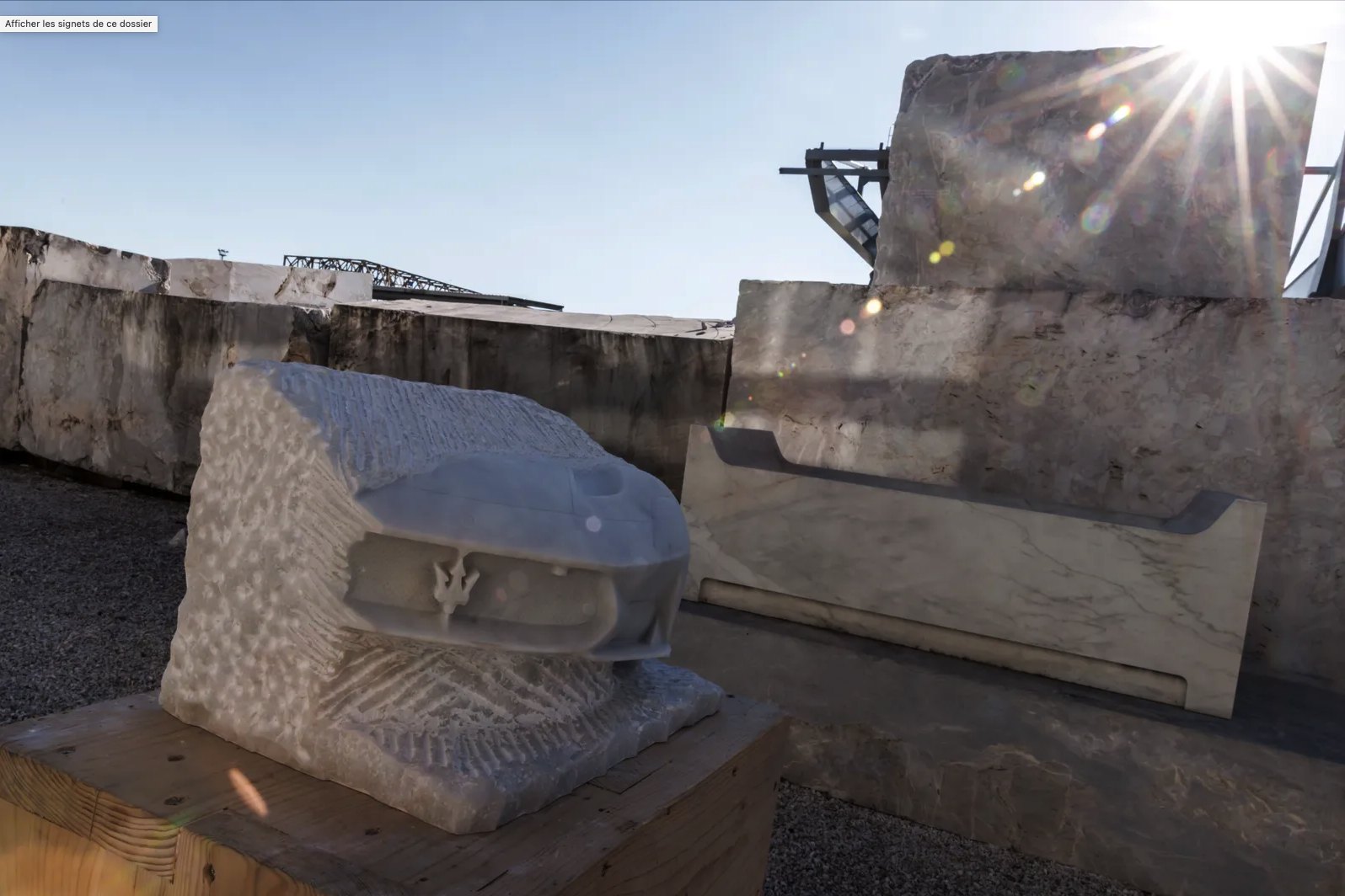 La série de photo à Carrare a été l'occasion pour Maserati de commander une oeuvre au sculpteur Filippo Tincolini = la pureté sortie d'un bloc de marbre !