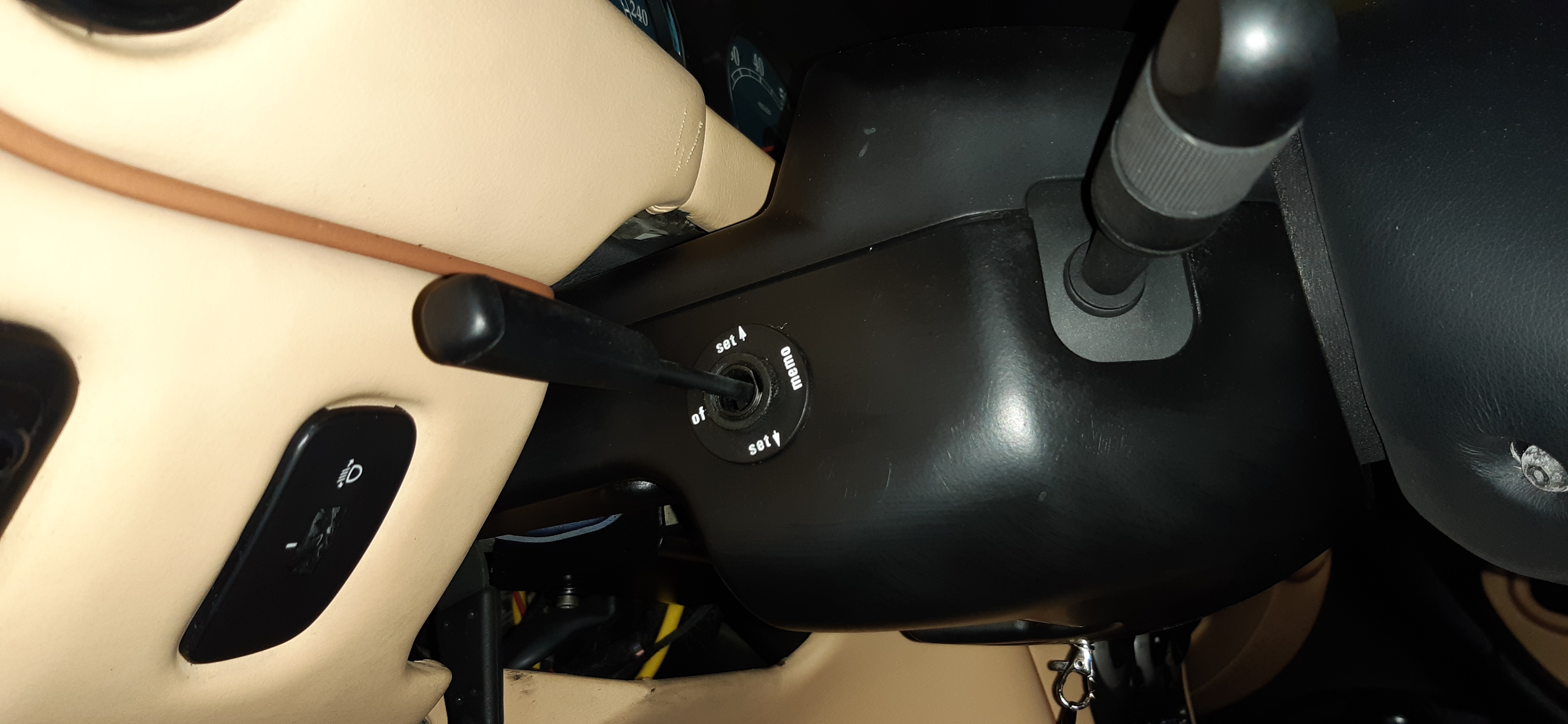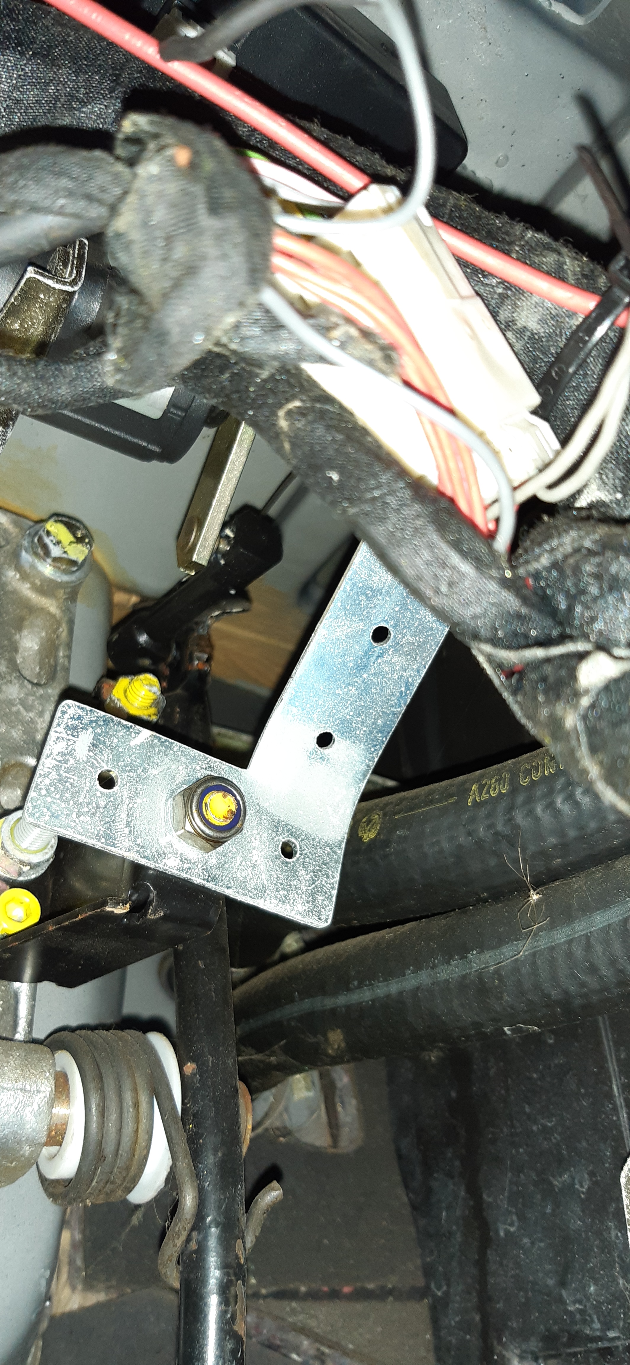 Ils ont fixé une patte en aluminium sur le support de la pédale d'accélérateur qui permet de maintenir la gaine du câble qui vient tirer la pédale. Je n'ai pas encore trouvé jusqu'où va l'autre extrémité du câble... Probablement vers un servomoteur.