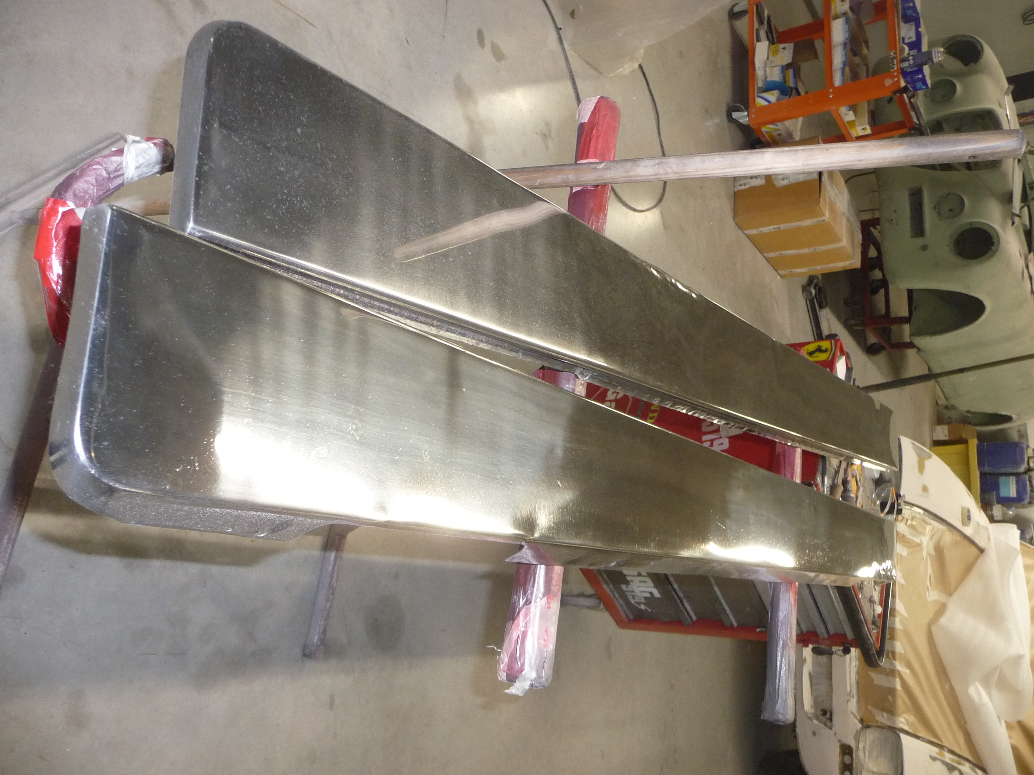 Du coup, le débosselage des grandes plaques inox latérales et le polissage des capuchons de roues (puis le re-chromage) prennent leur temps aussi, d'autant que l'artisan est surbooké...