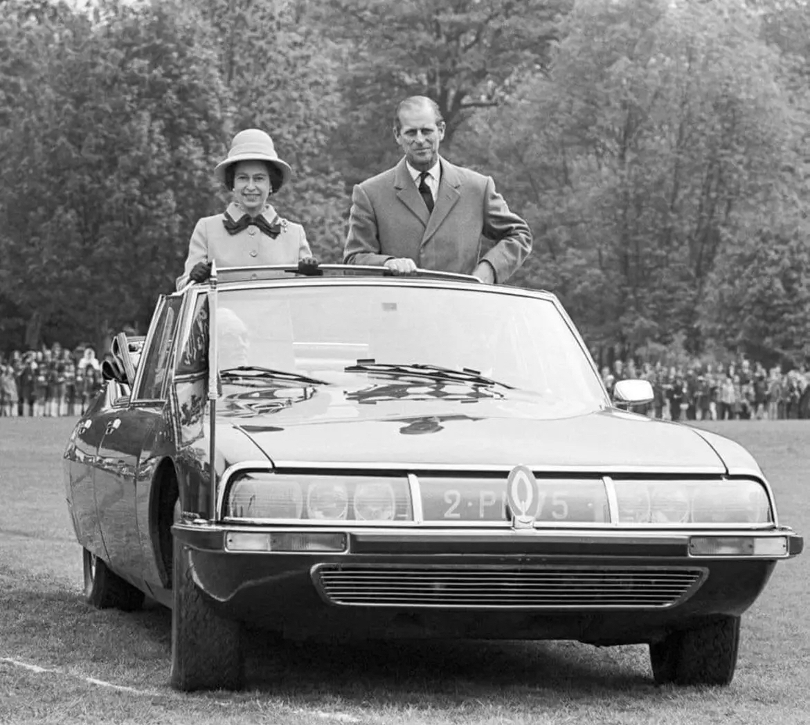 Cette voiture avait déjà 23 ans quand Jacques Chirac fut élu en 1995. La présidence de la République a gardé ces SM d'apparat très longtemps puisque elles étaient dans la flotte Élyséenne depuis la visite de la reine d’Angleterre en France en 1972, ici avec Georges Pompidou :