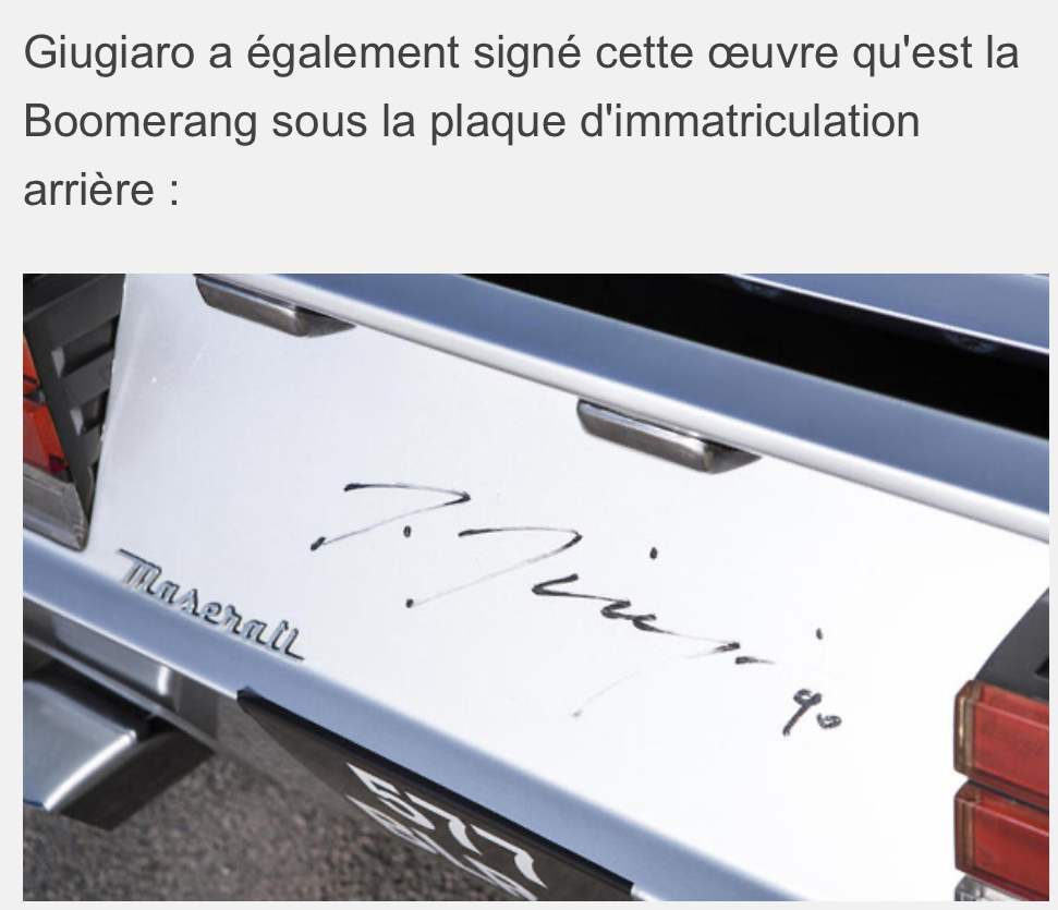 Le 77, signature de Giorgetto Giugiaro (gg ressemble à 77) sur la Boomerang. Peut être un lien ? Comme le grand Trident sur le capot ?