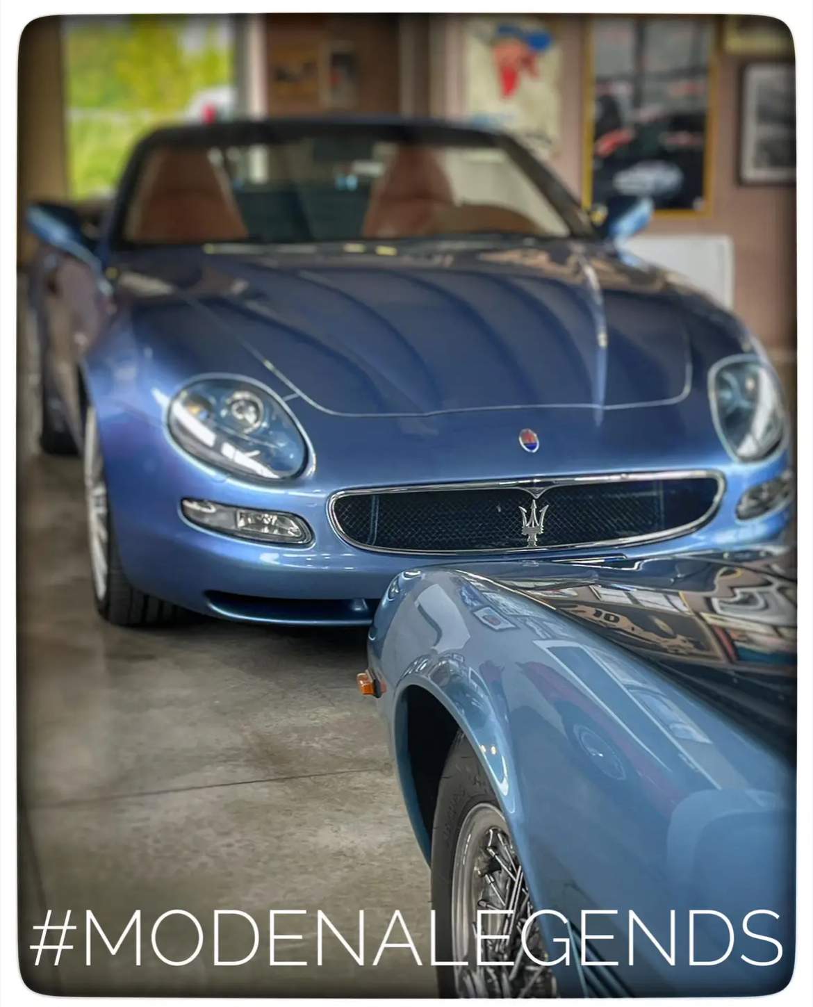 Umberto Panini avec son fils Matteo et une moto Maserati 160 cc semble -t-il ? Photo d’il y a 15 ans. Deux capolavori de Giorgetto Giugiaro se font face, les Spyders 4200 et Ghibli :