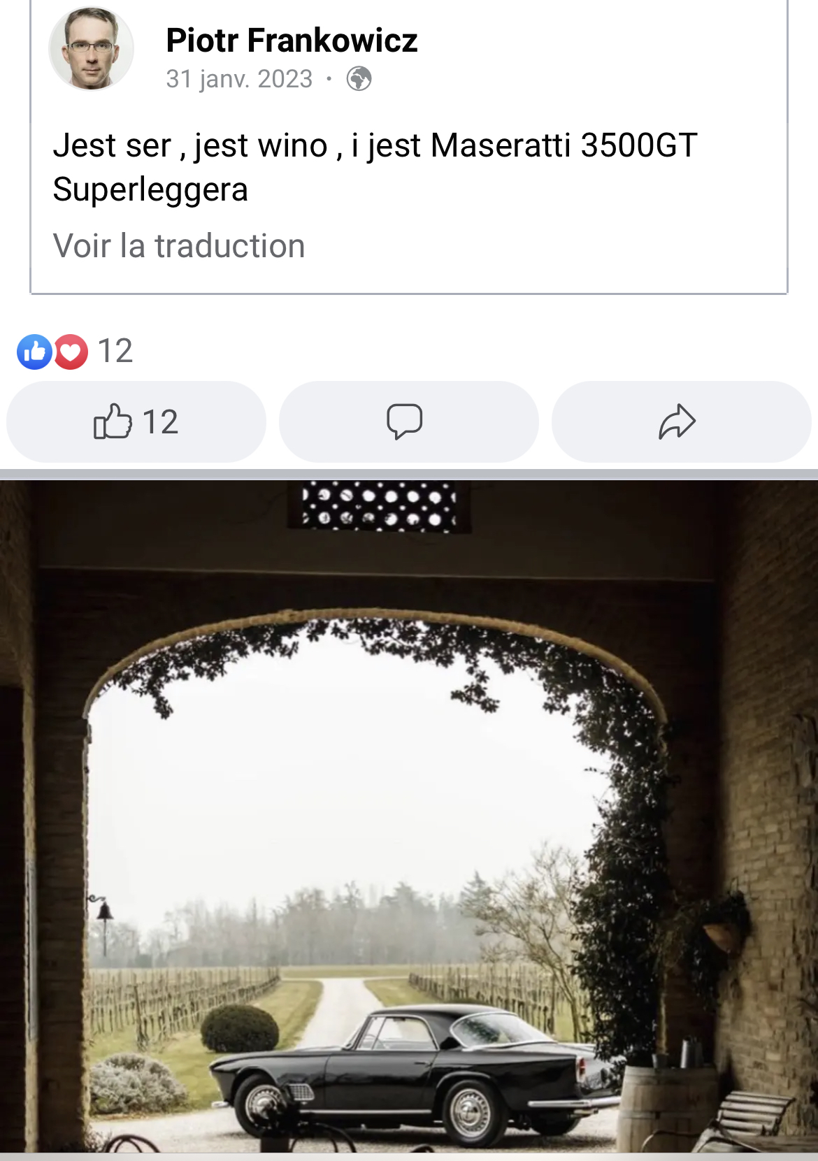 Giulio Cozzi est le concessionnaire Maserati de Milan. J’ai pu déjeuner avec lui au pranzo di Natale du club Maserati Italia. Très sympa et pas là que pour vendre des Maserati neuves. Il adore les Biturbo. C’est lui qui avait amené à Modène la plus vieilles des Biturbo existantes, cette belle bleue prototype qui appartient à un de ses clients et qui est entretenue chez lui :