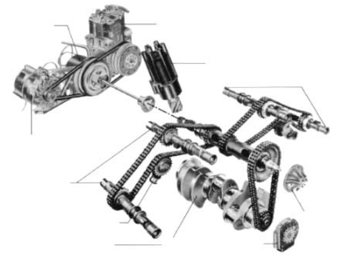 On voit bien l’arbre sortant du centre du V et entraînant les divers accessoires placés au dessus de la boite de vitesses :