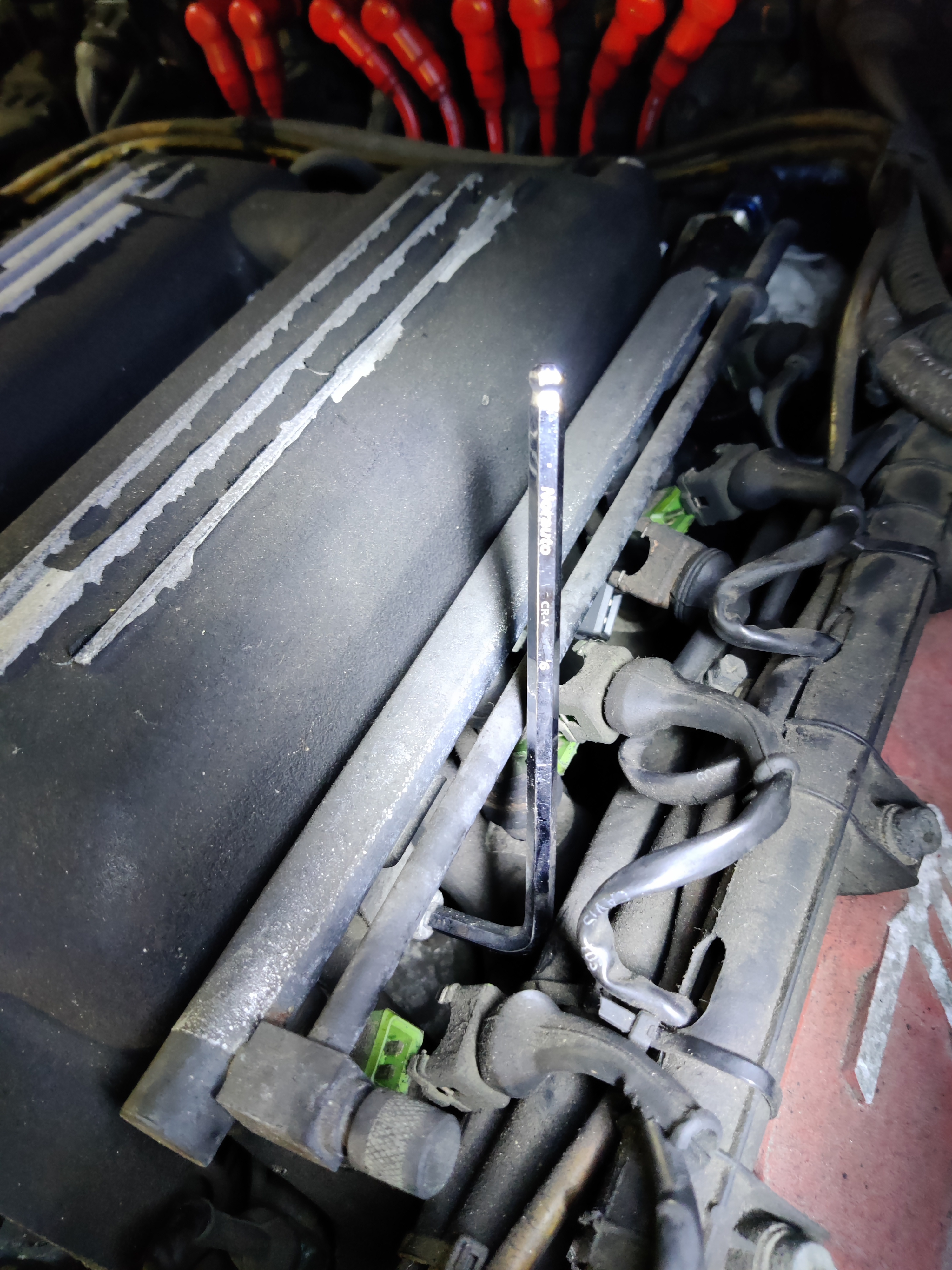 Après avoir dévissé les arrivées d'essence (et mis de l'essence partout), on dévisse les deux attaches des rampes des injecteurs, et on peut les déclipser.