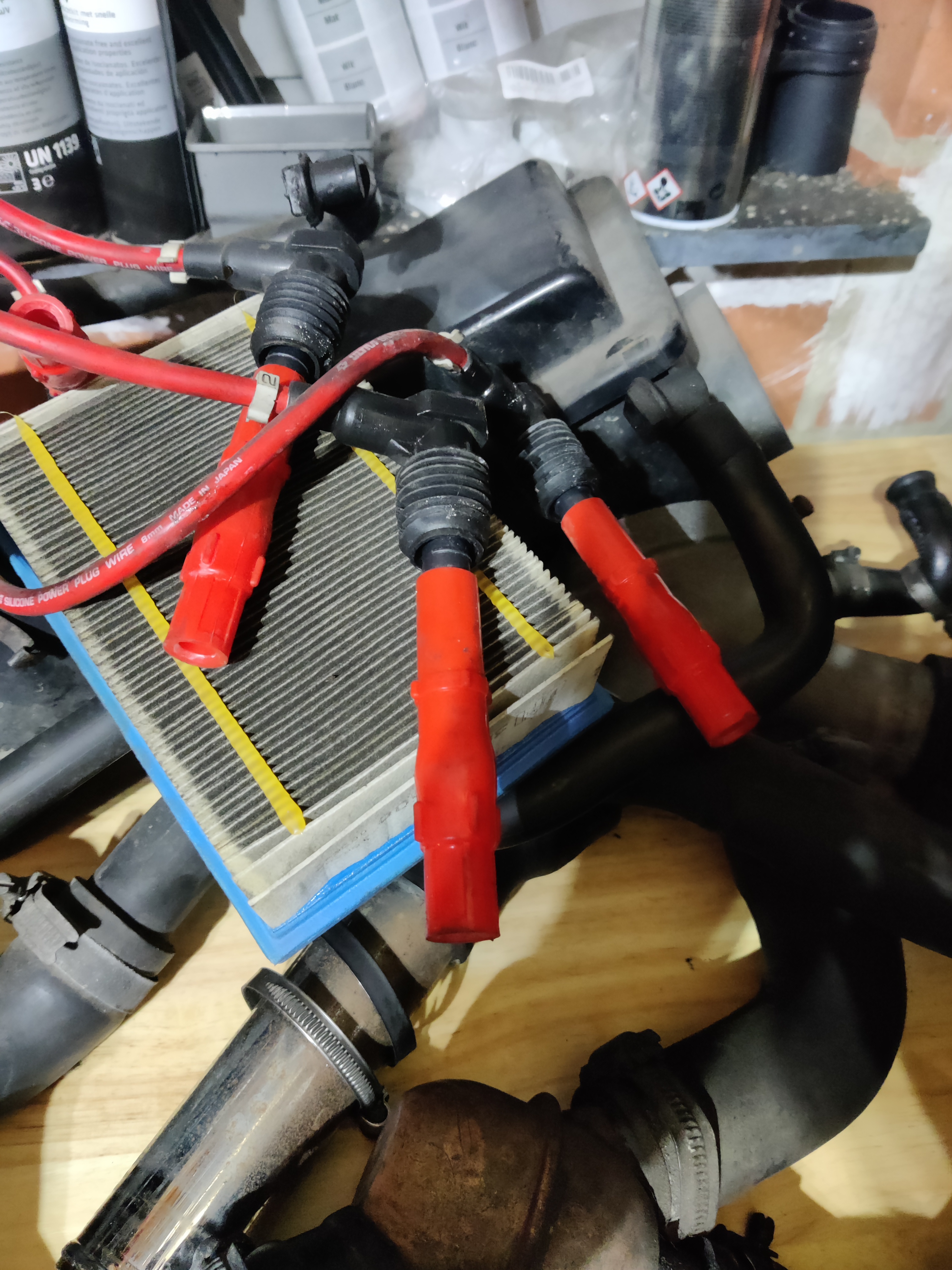 On commence par enlever l'araignée, ça c'est facile, et à l'inspection, les durites sont encore en bon état. Mais bon, je me demande si je ne vais pas tout remplacer quand même, ce n'est pas pour ce que ça coute (je me sers ici https://races-shop.com/105-silicone-hoses-and-clips )