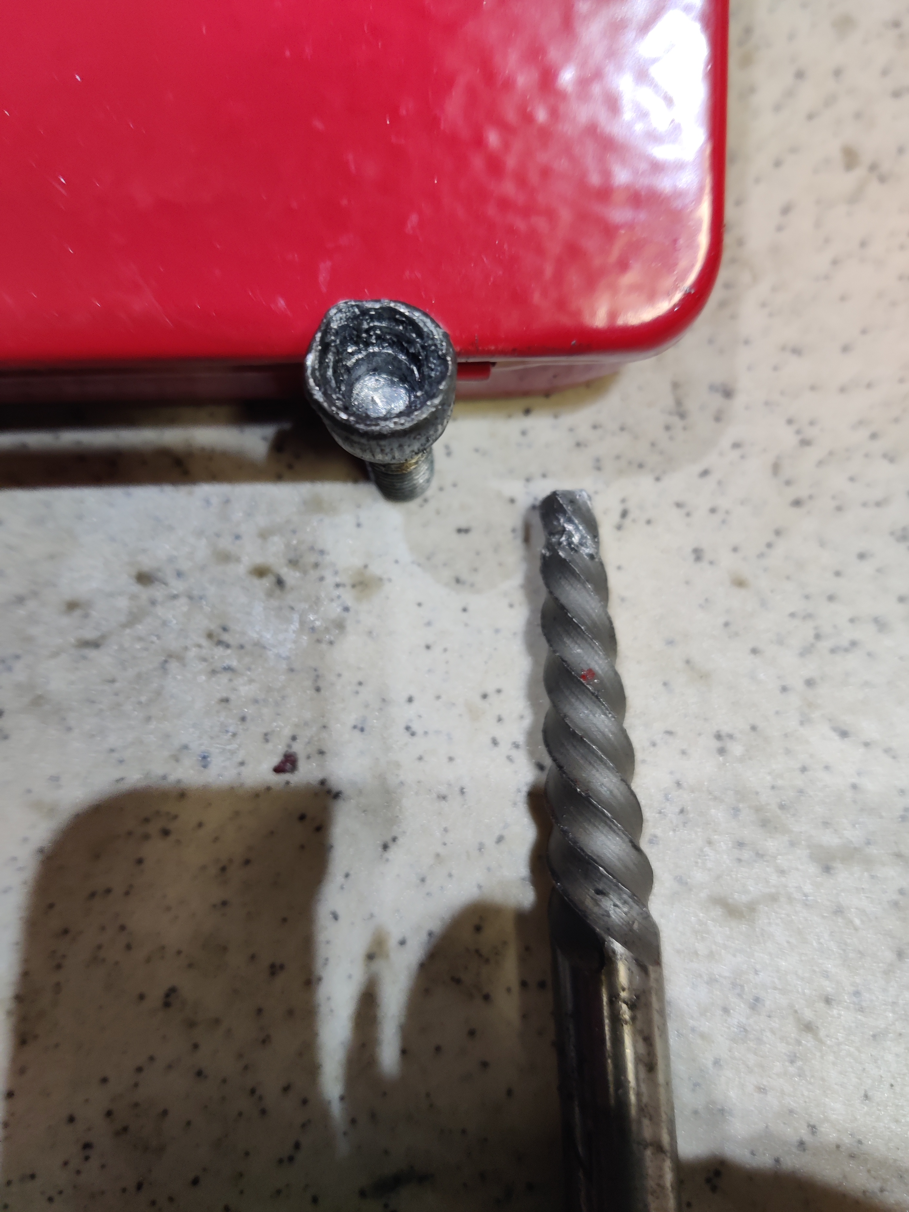 Je suis bon pour forer cette vis, ou de tenter une extraction (mais avec mon bol, je vais casser l'extracteur et ce sera encore pire).