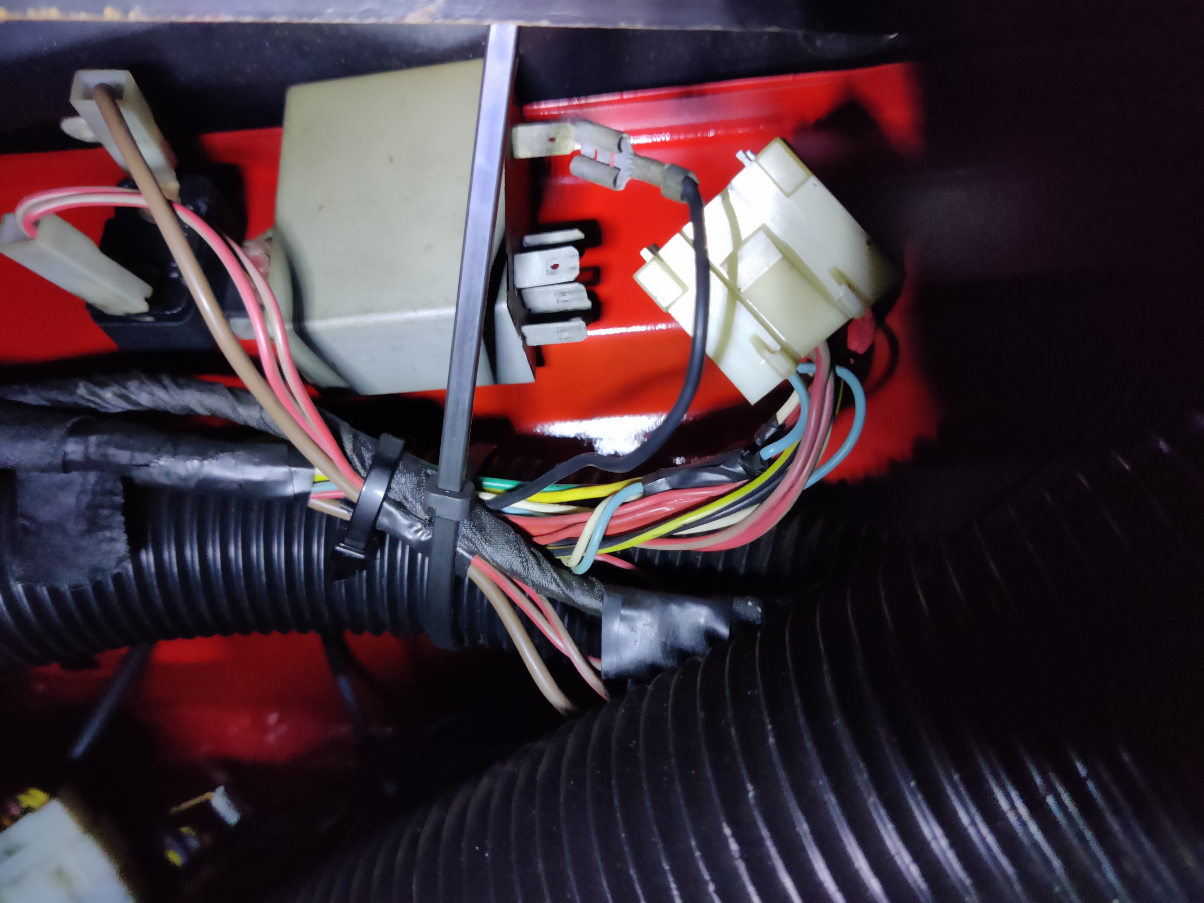 Un petit tour rapide dans l'habitacle (il y a plein de place du coup sans les sièges), je retire les tapis de sol et la boite à gant pour accéder à la boite à fusible (vu qu'il y a plein de trucs qui ne vont pas (les fenêtres, l'ouverture des portes, le tableau de bord