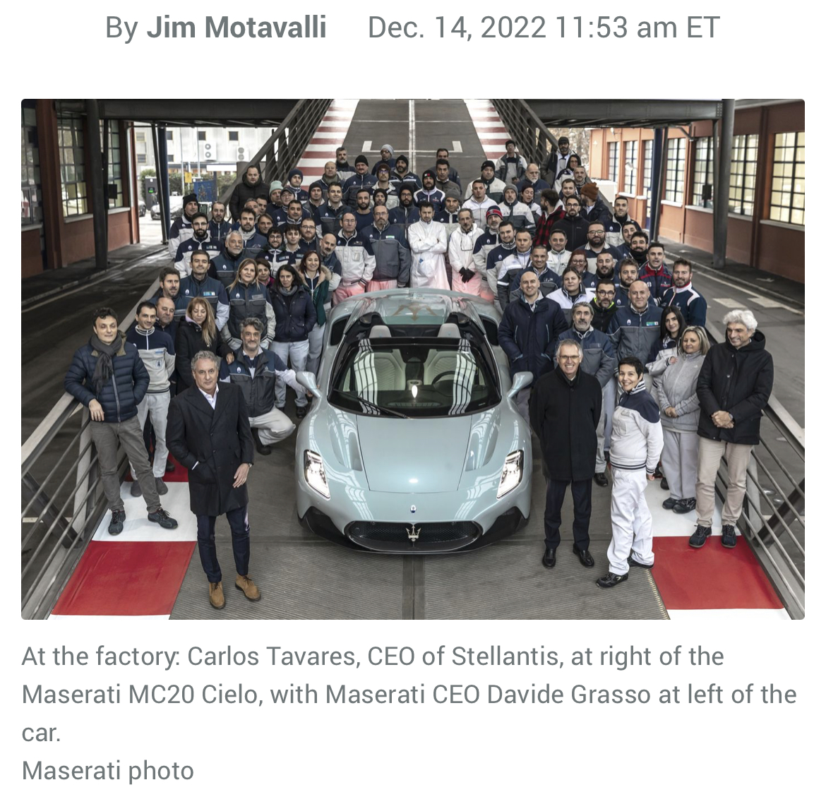 Le big boss de Stellantis, Carlos Tavares, était à Modène à l’usine Maserati le 14 décembre 2022 (14 dec, la date des mythiques conf de presse de De Tomaso, mais c’est peut-être un hasard). En bas de la rampe autour d’une MC20 Cielo, de Davide Grosso le directeur de Maserati et du personnel :