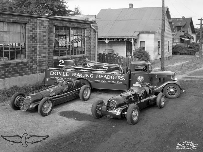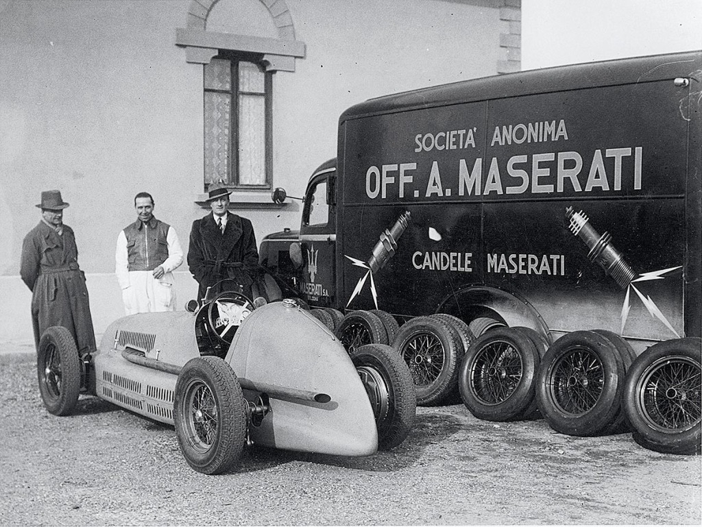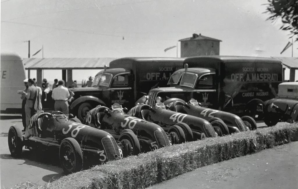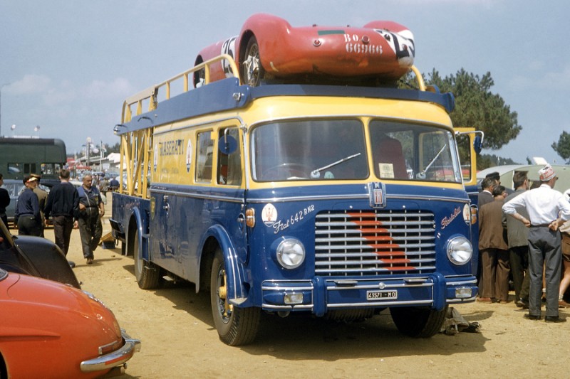 Sans doute l'un des plus anciens, le Lancia EsaDelta, probablement années 1930 à 1938 Puis le Fiat 631. Avant la Coppa Principessa à Naples en 1938. Toujours 1938 et le Fiat 631 derrière une 4CLT, avec des dessins de bougies qui ont fait leur apparition : Idem en 1939. Et l'on voit qu'il y a plusieurs voitures, mais aussi plusieurs camions ! Ici, Fiat 621 toujours, ainsi que la remorque, avec l'impressionnante 4CL 1500 aerodinamica Le fameux transporteur Boyle et ses voitures bordeaux métallisé à Indianapolis en 1939. Bête de somme de tous les constructeurs sportifs de l'après guerre, le OM Leoncino, ici utilisé par Maserati Motocycles. Pour les voitures de course, il semble que Maserati ait privilégié plutôt le Bianchi Visconteo, sorti en 1952 Vu ici au Nurburgring un transport de l'écurie Camoradi avec la Maserati Tipo 61 Idem au départ d'Italie (ou à l'arrivée)