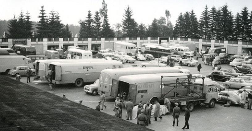 Au Nurburgring en 1957: de gauche à droite = Fiat 682RN, Fiat 642 aux portes arrière plus carrées, et un Bianchi devant une voiture bâchée.