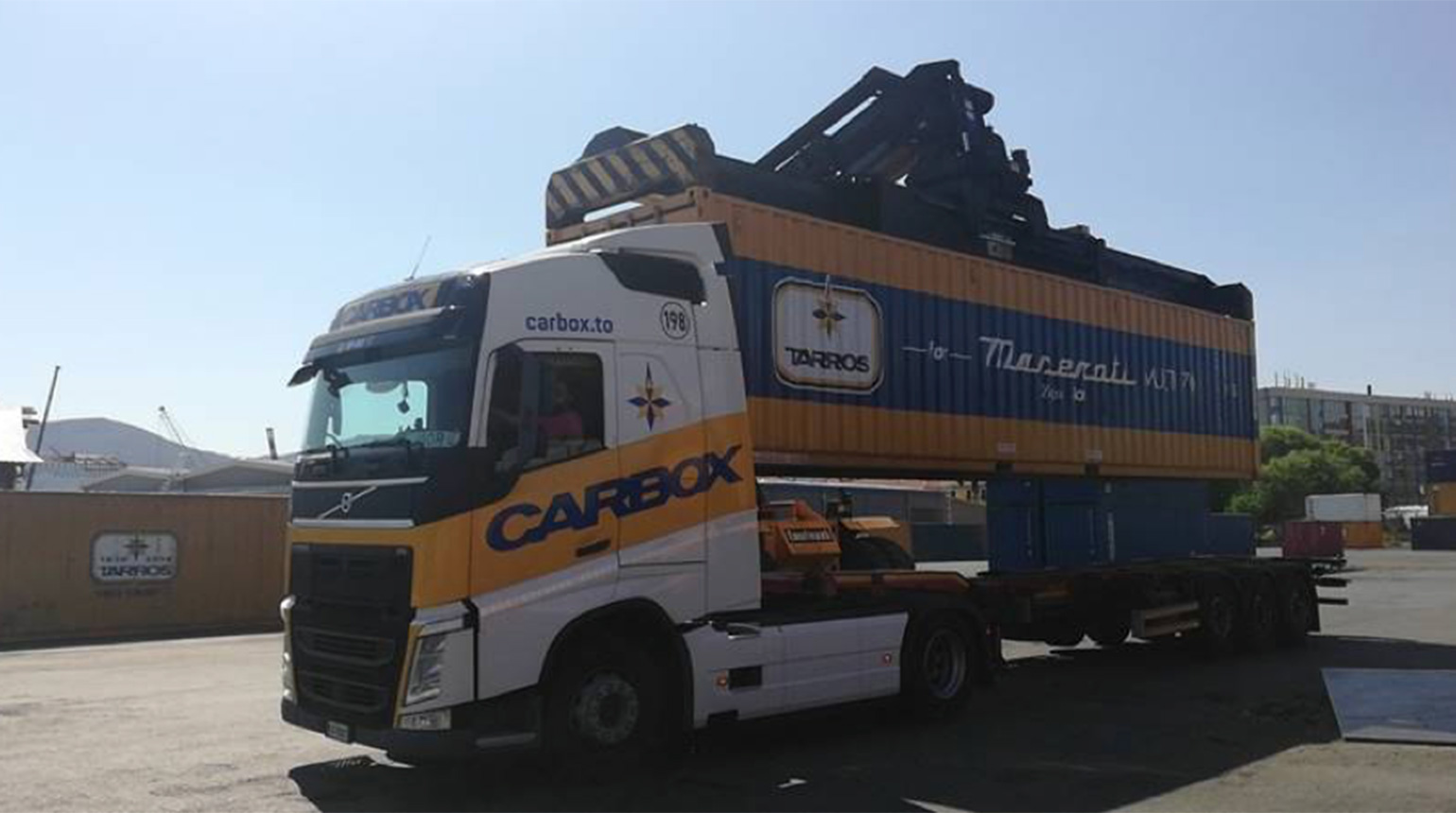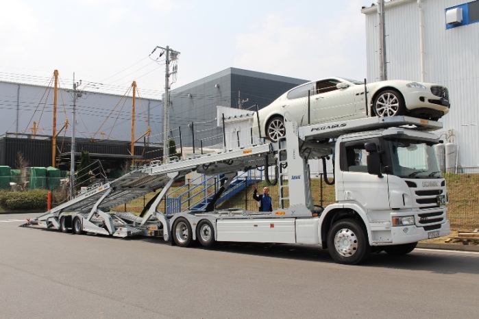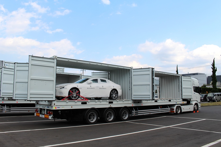 Dans le haut de gamme, le semi-remorque tout fermé, avec tracteur Scania R440, une capacité max de 5 véhicules. Il dispose d'une rampe de déchargement Dholandia de capacité 2t ou 4t. Le plus récent véhicule est ce combiné transporteur plateau + remorque réalisé par le spécialiste italien Rolfo, sur chassis Scania . Il peut porter 8 ou 9 véhicules, notamment grâce à un système d'essieu supplémentaire (la petite roue) réalisé par la société Estepe aux Pays-Bas. Autre production récente de Rolfo, ce semi-remorque à 6 voitures = Soit une de plus que la remorque de conception traditionnelle = Pour les déplacements internationaux, le container reste privilégié, ici sur un format spécial à ouverture latérale = Enfin, pour les livraisons à domicile, le camion simple plateau a au Japon une limite de charge dans les 1.5t : donc TransWeb utilise plutôt des Mitsubishi Fuso 20t. qui peuvent prendre en charge une Quattroporte