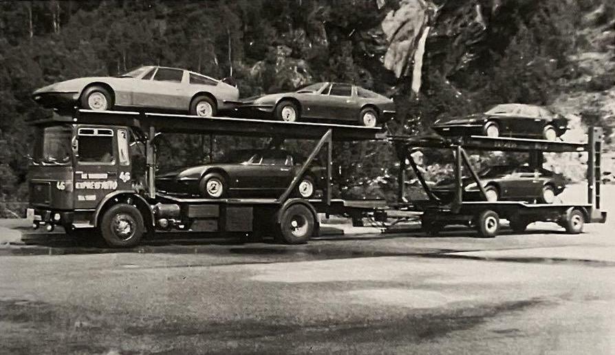 Début des années 70 = les voitures neuves sorties de l'usine de Modena ne sont pas encore enveloppées comme aujourd'hui dans un cocon protecteur blanc = ici, un camion SAVIEM SM12 des établissements Transports Express Auto va livrer 5 Indy neuves en Angleterre.