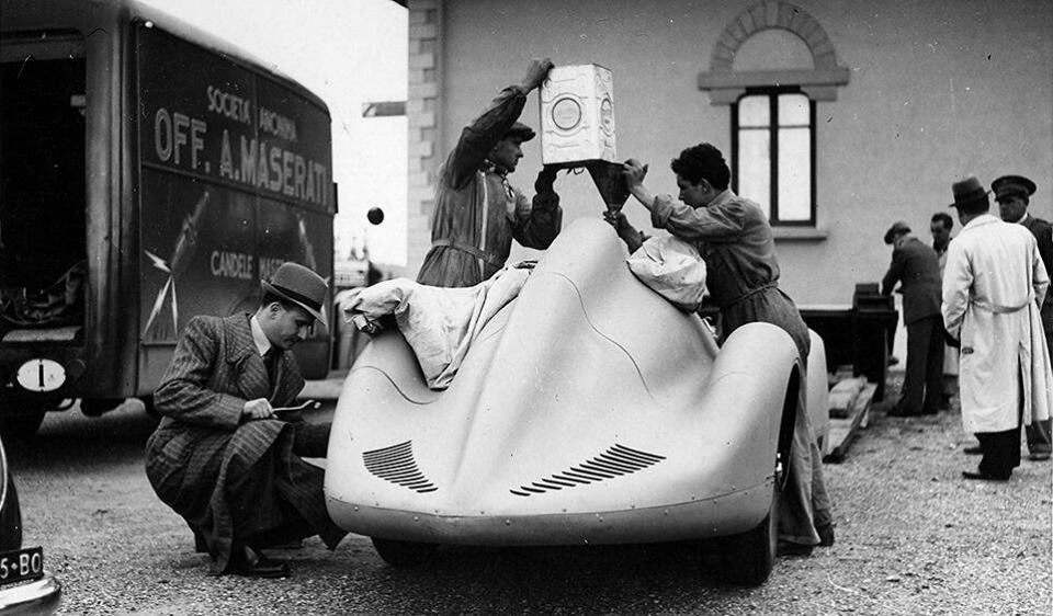 Guerino Bertocchi, en casquette, ne fait pas que le plein, il a aussi assuré la mise au point châssis-suspensions (collaudo) comme pour toutes les Maserati depuis 1936. Luigi Villoresi peut partir tranquille pour ses essais de vitesse :