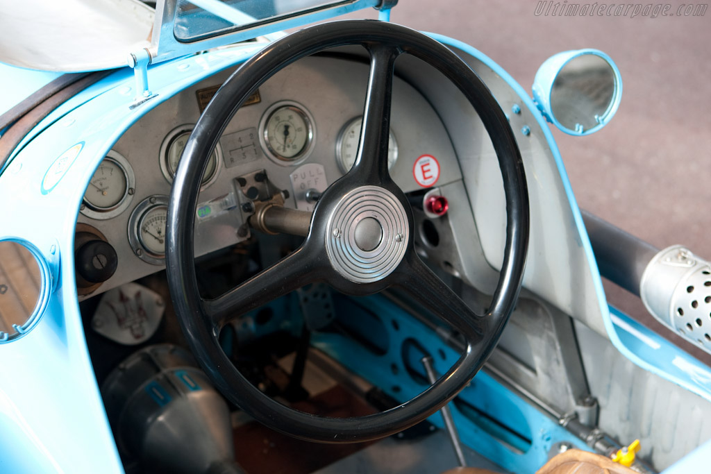 Contrairement à toutes les Maserati qui, depuis le début de la marque, étaient toutes équipées de deux arbres à cames en tête, la V8 n’en a qu’un seul par banc de cylindres et qui dépasse du fuselage ce qui nécessite un carrossage spécial :