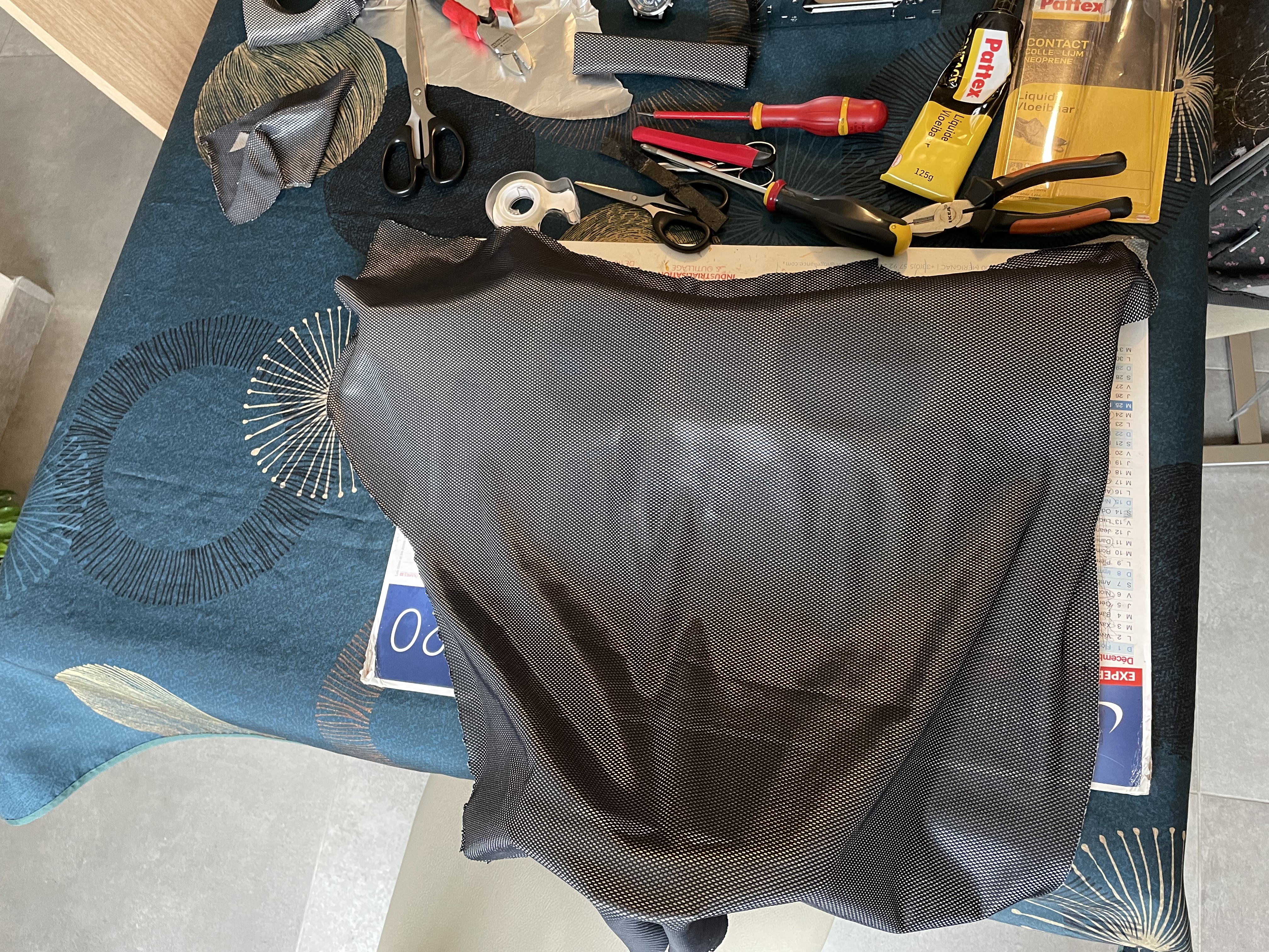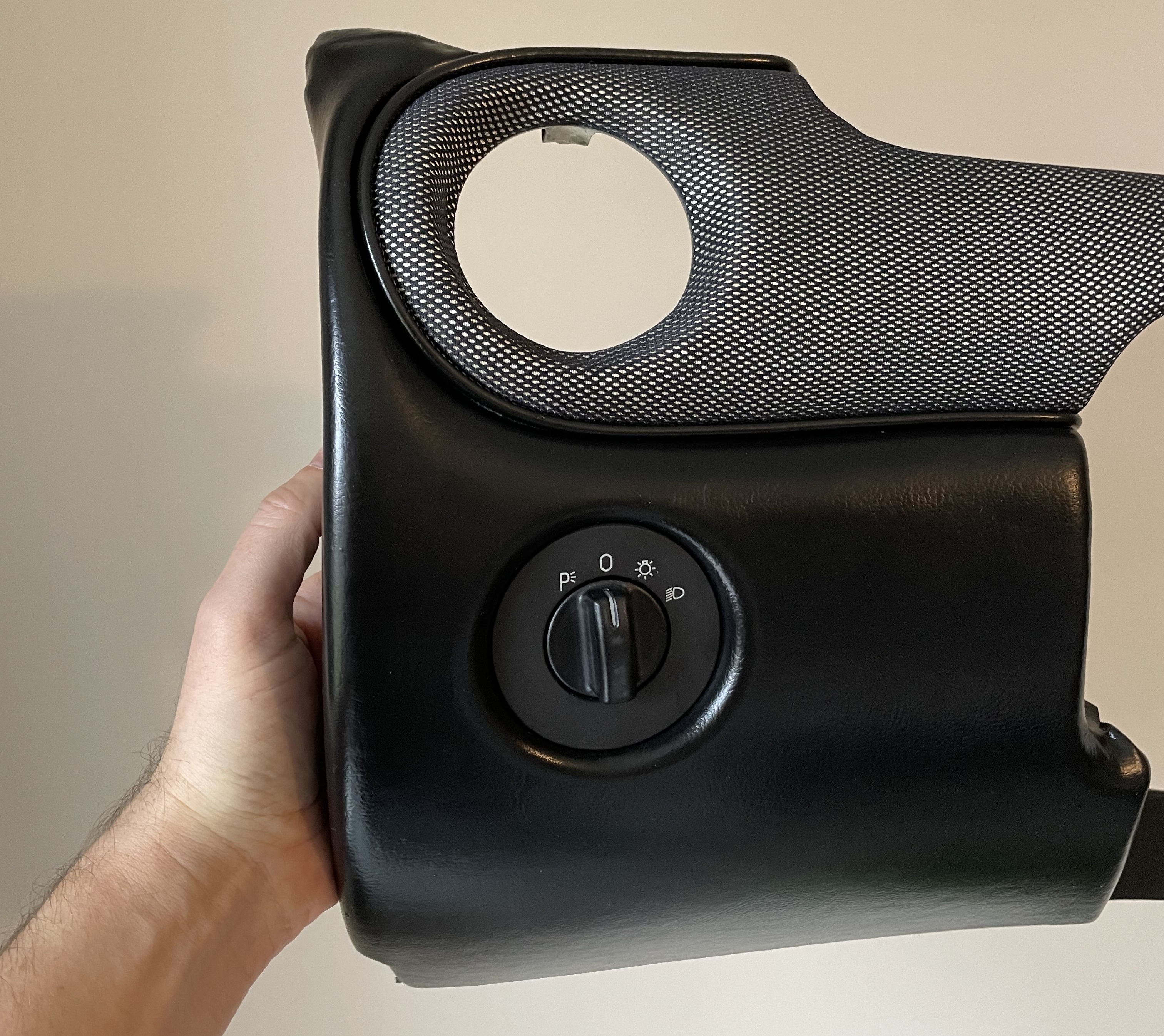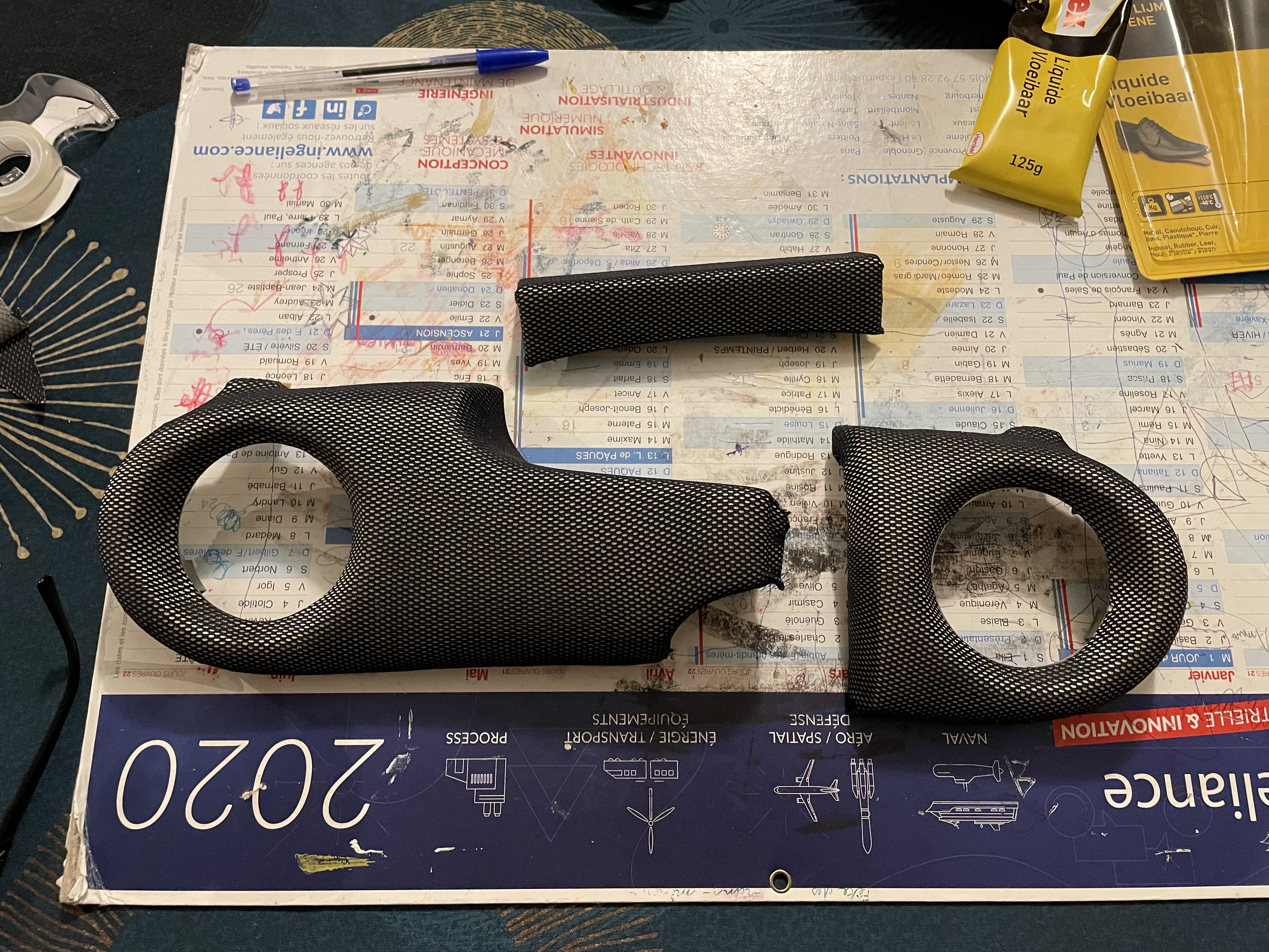 J'ai donc récupéré le tissus du ciel de toit qui se décollait pour recouvrir les parties ivoire et assortir le nouveau tableau de bord Je recouvre l'ivoire en collant seulement sur l'arrière des pièces de manière à pouvoir enlever le tissus technique sans abimer le cuir le jour où