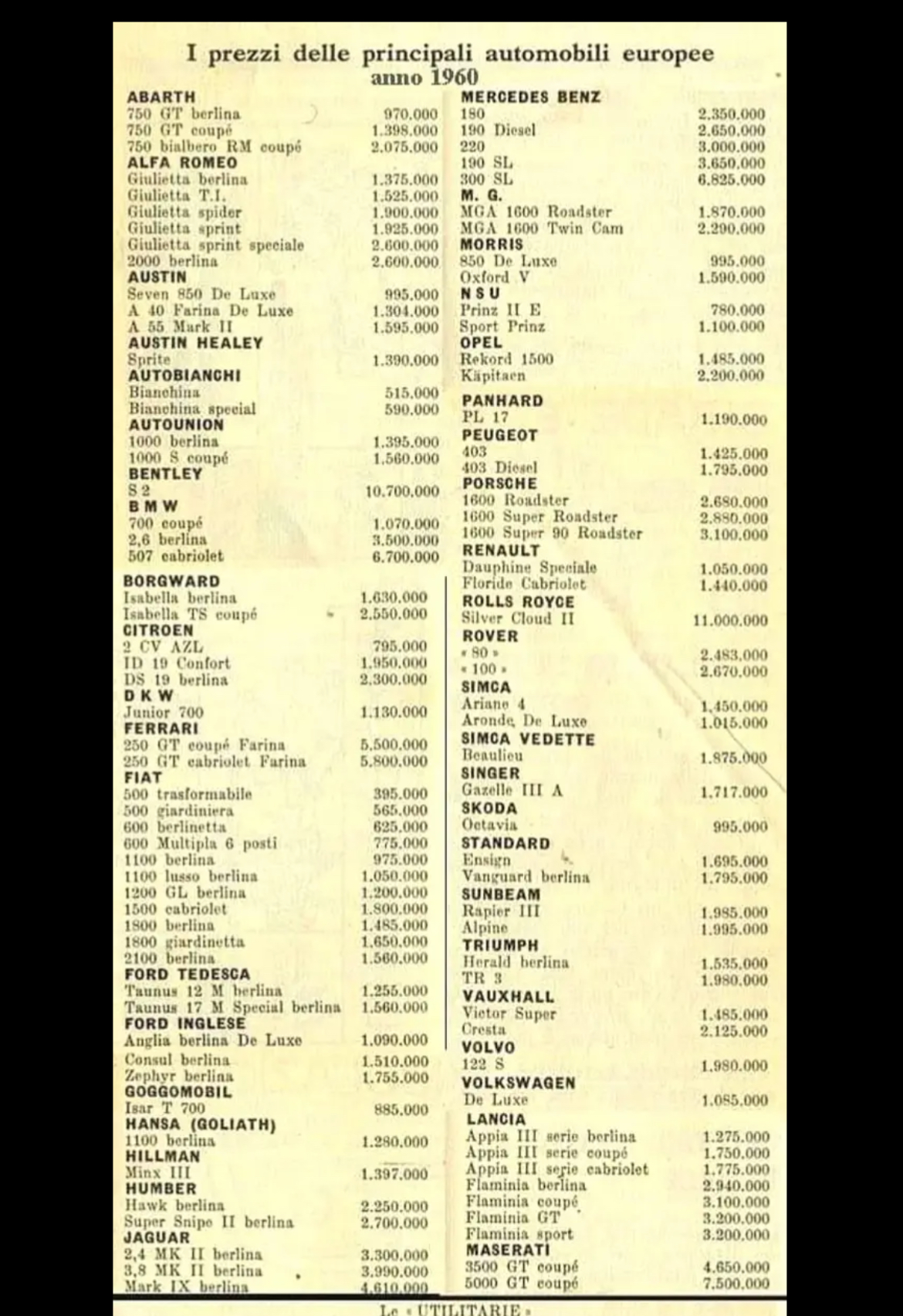Interessant, la Maserati 5000 GT était plus chère que la Mercedes 300 SL à portes papillon. Seules les Rolls et Bentley étaient plus onéreuses ! Les prix sont en Lires.