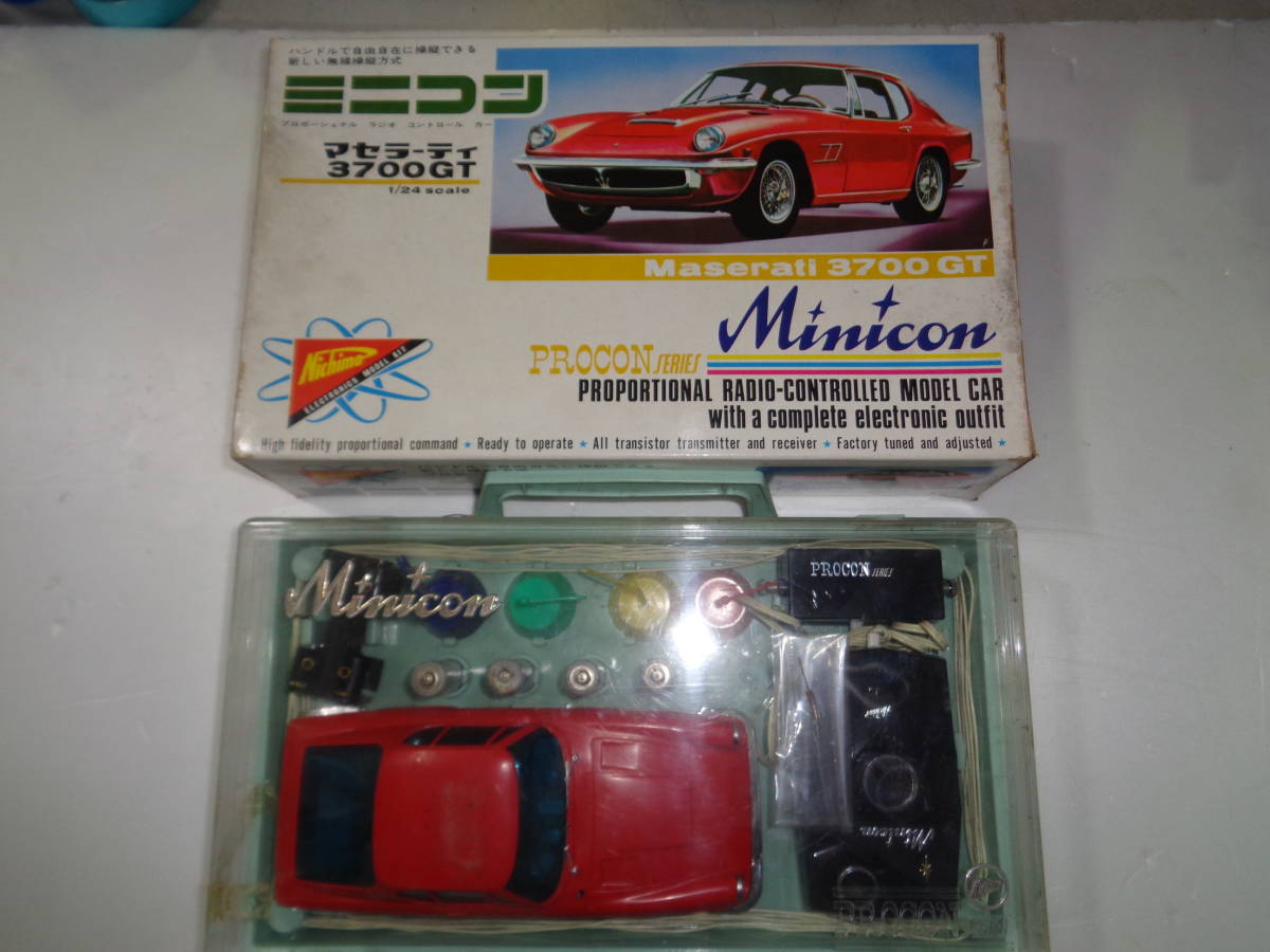 Ce n'est pas un modèle à monter, mais son boîtage l'apparente aux modèles précédents = le fabricant de modèles réduits Nichimo proposait cette 3700 GT, pas encore appelée Mistral dans sa gamme Minicon = des miniatures radio-commandées, ce qui à l'époque où elle est sortie devait être une technologie assez incroyable.