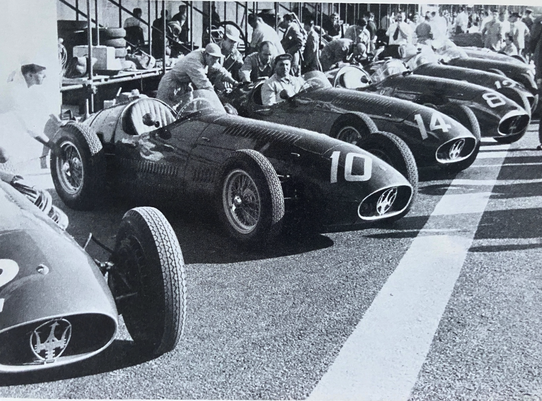 Toutefois, c’est bien l’année 1954 qui voit le Trident de radiateur devenir la norme, également en Formule 1. Ici à Reims au Grand Prix de France 1954, sur une 250F. Et ici au Grand Prix d’Espagne 1955, c’est toute l’écurie qui montre la combinaison badge de carrosserie + trident de radiateur. De même, aux Mille Miglia de 1955, le Trident semble bien en place sur ces A6GCS, bien que le dessin du cadre de fixation soit encore assez variable entre les voitures. Il est à noter que la tendance n’est pas suivie par Ferrari : le cheval cabré en métal sur la grille de radiateur en plus du badge rectangulaire jaune sur la carrosserie n’apparaît qu’en 1956 sur une Ferrari de route, et n’apparaitra en course qu’en 1960 avec les 250GT, sans que ça devienne la norme.
