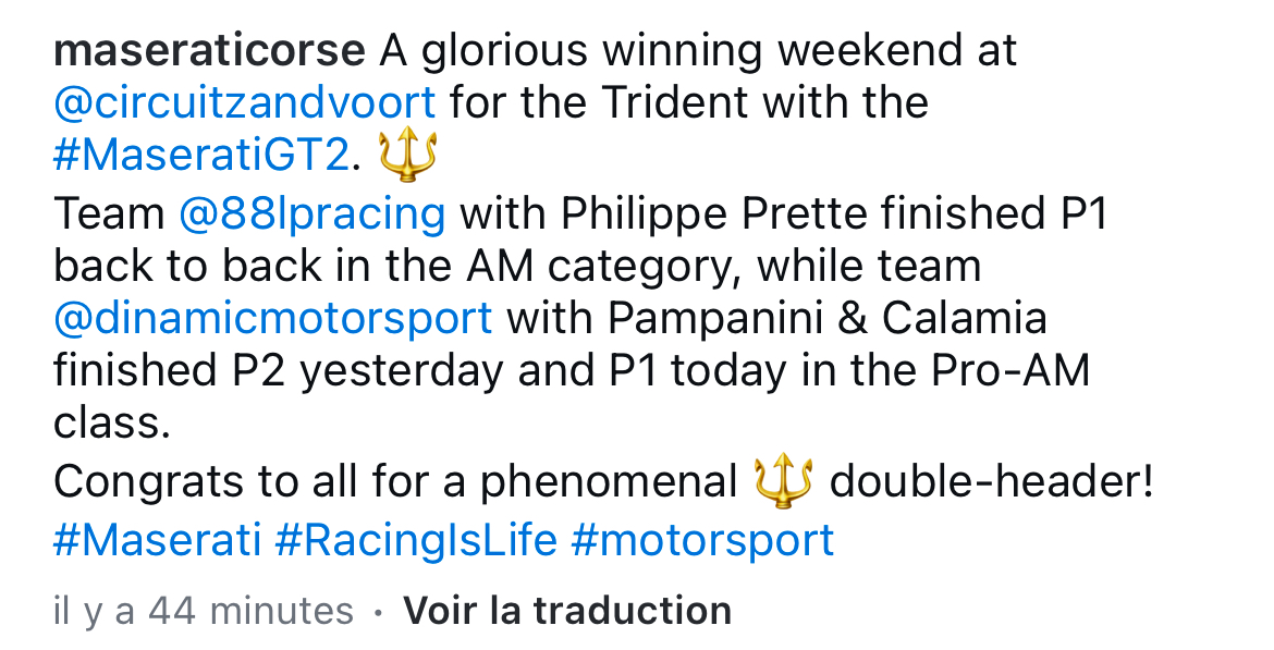 Ces 17 et 18 mai 2025, Maserati a connu un week-end exceptionnel, à faire rêver n’importe quel constructeur de voitures de courses, avec une victoire en Formule E (pilote Stoffel Vandoorne) à Tokyo et deux victoires sur MC20 GT2 à l’autre bout du monde, à Zandvoort (pilote Philippe Prette, le champion 2024, le samedi en AM et pilotes Calamia et Pampanini dimanche en Pro AM). À noter que ce dernier équipage avait signé la 2 eme place samedi en pro AM. Au total 3 victoires et une seconde place pour Maserati ce week-end ! Bravo à Maserati Corse !