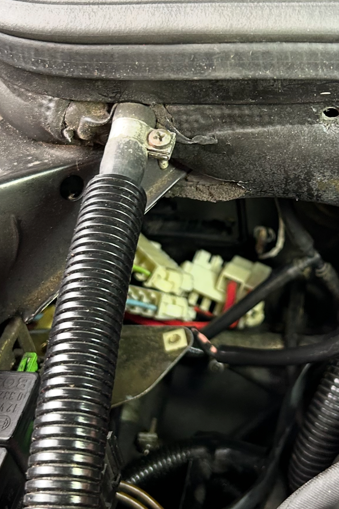 Côté habitacle, on débranche toutes les fiches sans les repérer, comme coté moteur, et on peut extraire la boîte à fusible par l’habitacle. Ci-dessous la boîte est extraite , on est dans l’habitacle et on voit les fiches côté moteur qui apparaissent plus sombres que les blanches de l’habitacle :