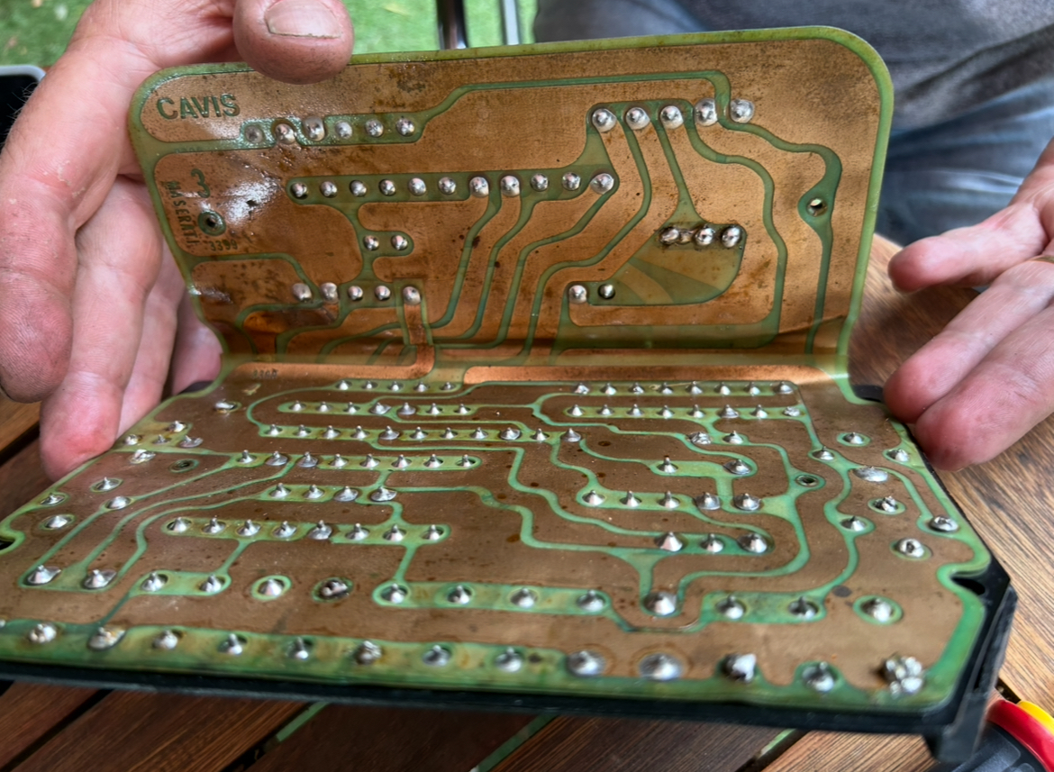 À l’intérieur du boîtier on découvre la carte circuits imprimés en « porte feuille » , comme on faisait à l’époque. Souvent ça craquait à la pliure mais celle ci n’est pas trop mal malgré une drôle de couleur à gauche :