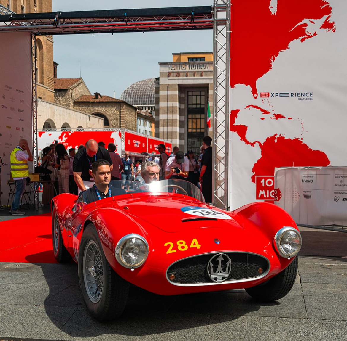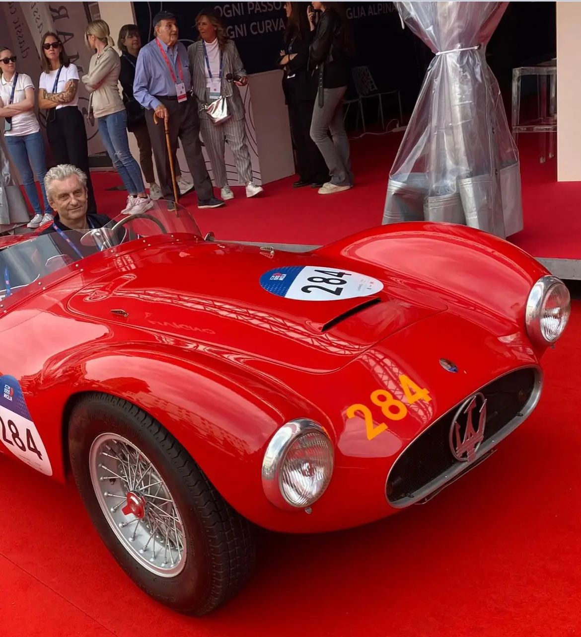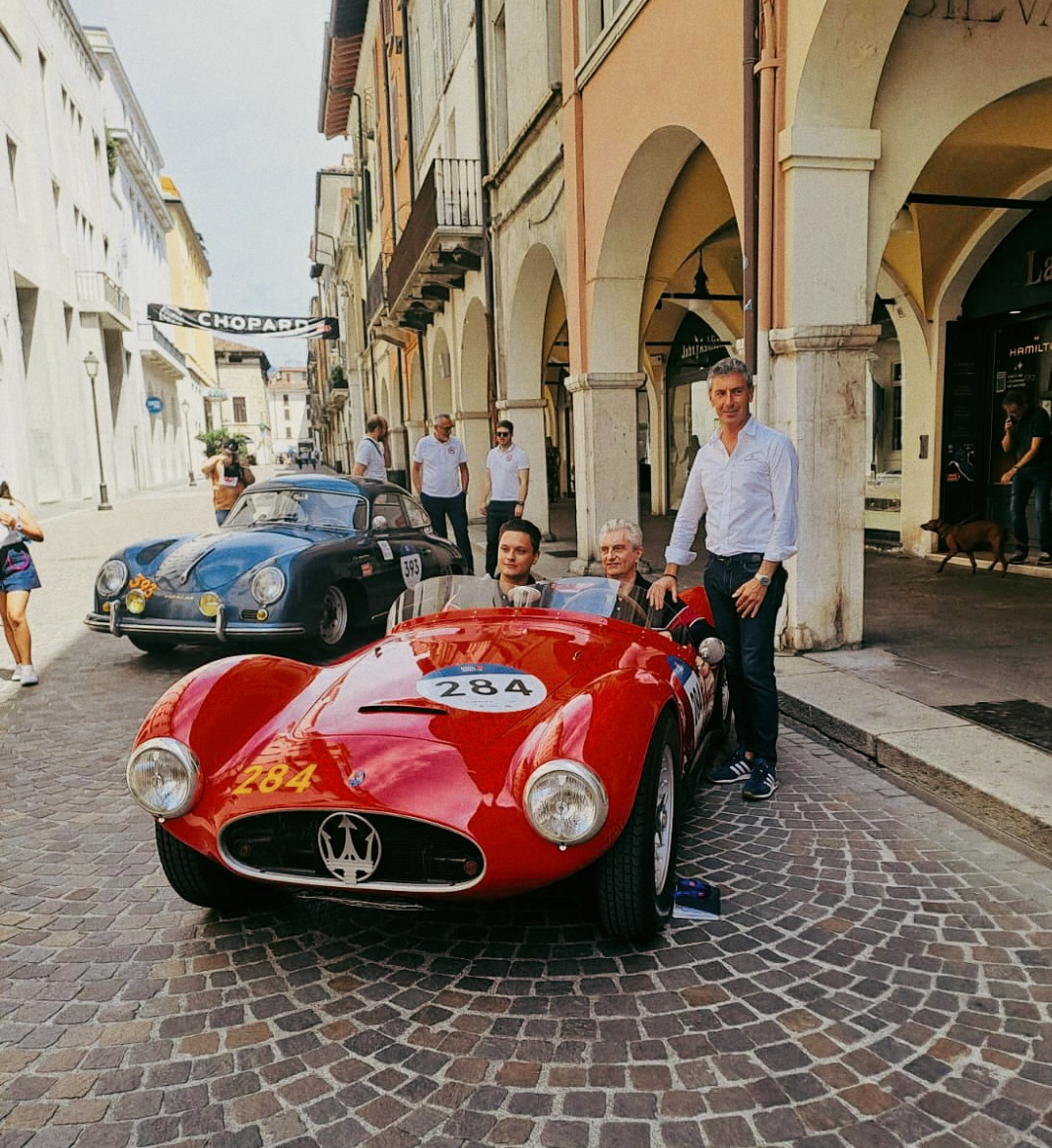 Partie de Brescia comme tous les participants aux Mille Miglia, # 2043 a fait une pose à Modena où l’ingénieur Cristiano Bolzoni, qui avait réalisé sa certification Maserati Classiche, est venu la saluer :