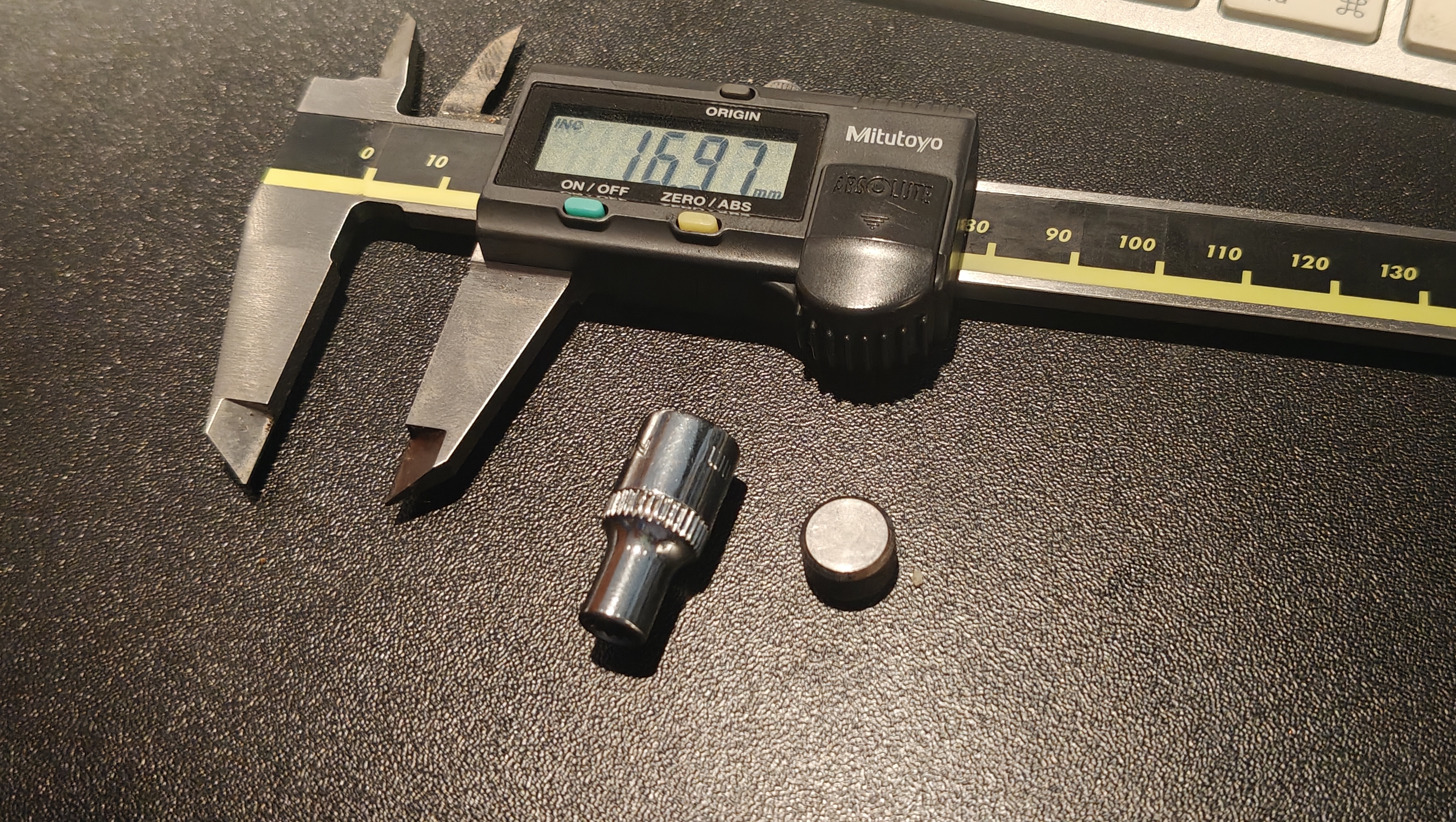 On peut régler le pied à coulisse numérique pour prendre en compte la taille de la douille et la soustraire de la mesure, de façon à obtenir uniquement la mesure de la pastille (pas sur que ce soit clair, je fais pour un mieux).