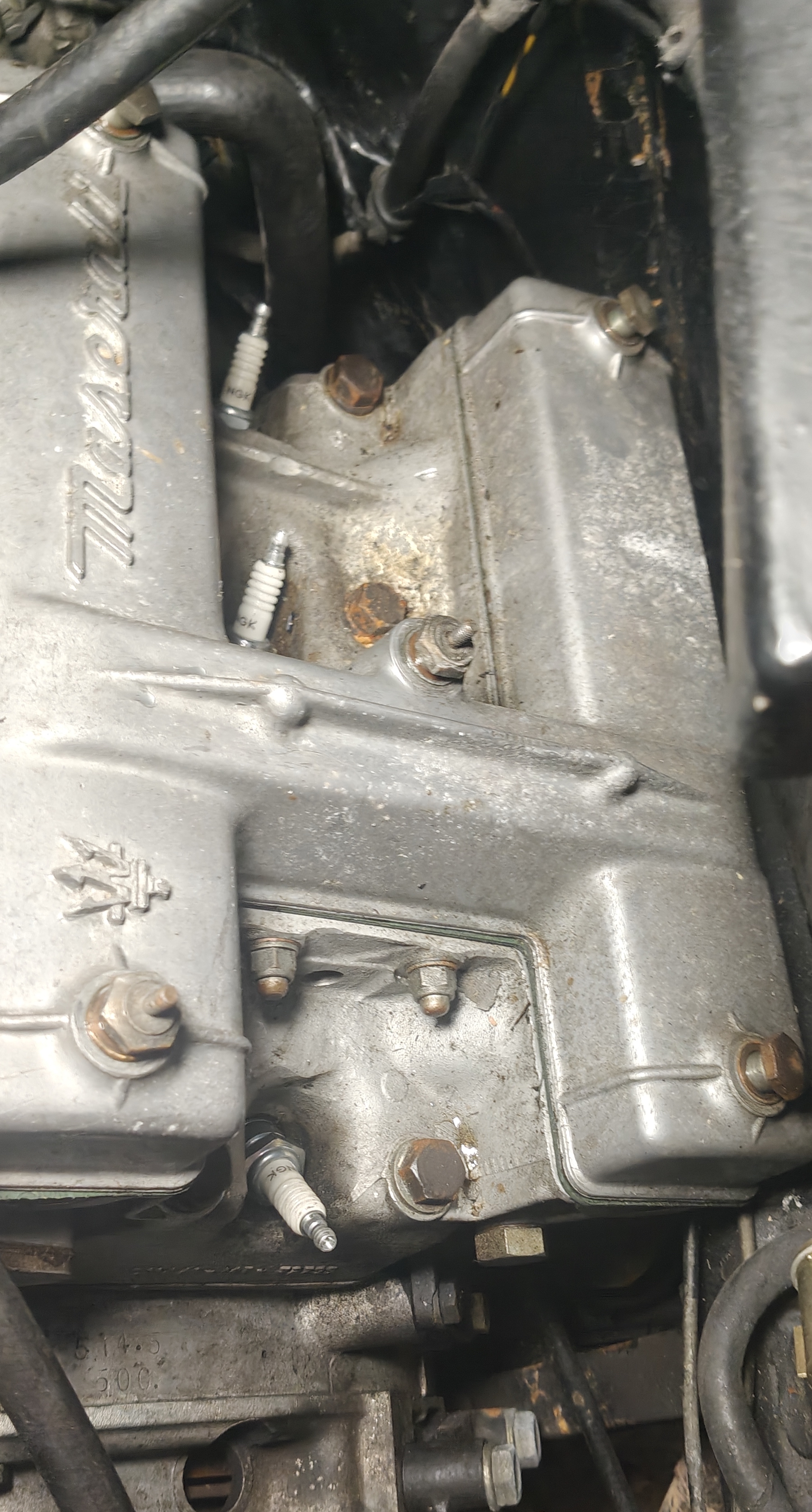 Tout d'abord, enlever le couvre culasse, c'est simple, on déboite le faisceau des fils de bougies, et le couvre culasse (en H) est maintenu par 5 boulons. Ceux-ci restent attachés au couvre culasse même une fois dévissés, pratique (ils le sont sur la photo).