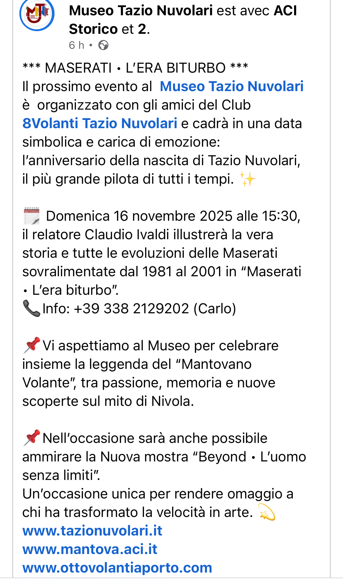 Le dimanche 16 novembre 2025, Claudio Ivaldi, le président du Maserati Club Italia, sera au musée Tazio Nuvolari de Mantoue pour présenter et dédicacer son livre, une véritable bible sur les Biturbo.