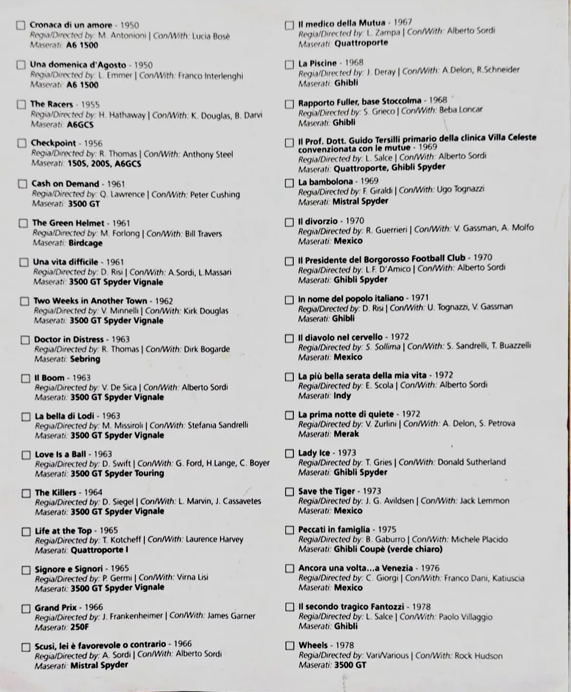 Le Club Maserati Australie a publié une liste chronologique des films où l’on peut voir une Maserati et le modèle concerné 😉